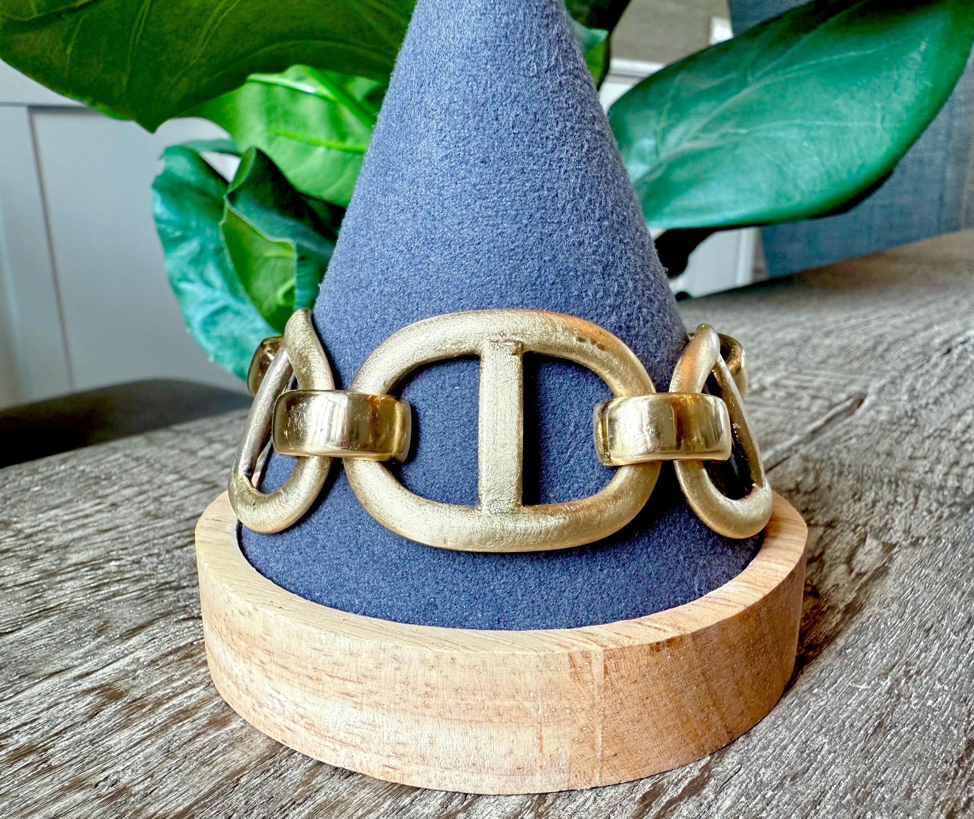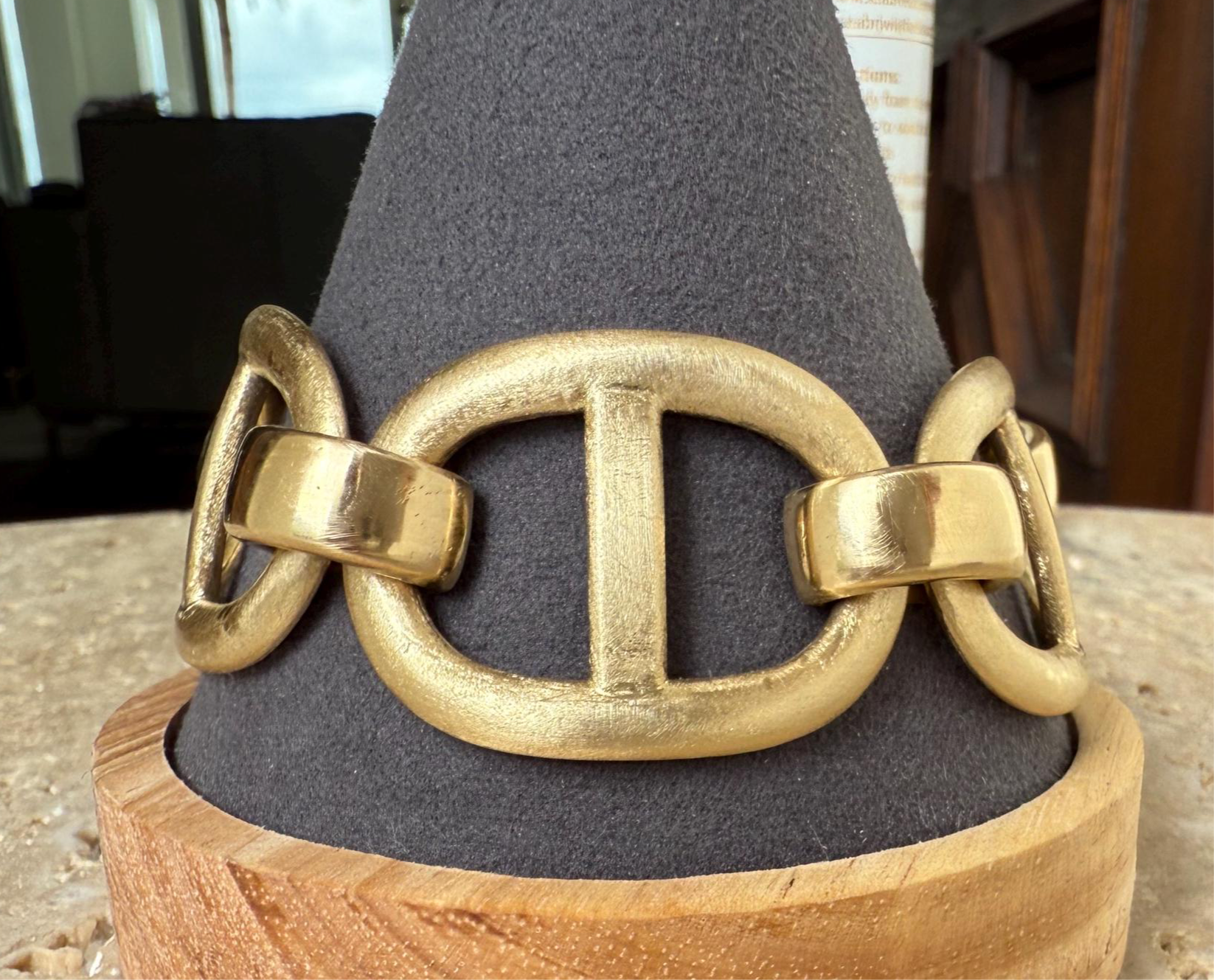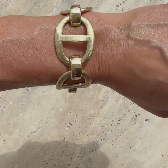 A very large Mariner bracelet. This bracelet is 14K gold and hollow, but weighs over an ounce of gold at 30 grams. These bracelets are very hard to find. It’s large in width and is 7.75” long. Each link is 1.5” long. My wrist is 6.25”. An entire 1.5” link could be removed to make the bracelet fit more snug. The large links have a matte gold texture and the connecting links are polished.