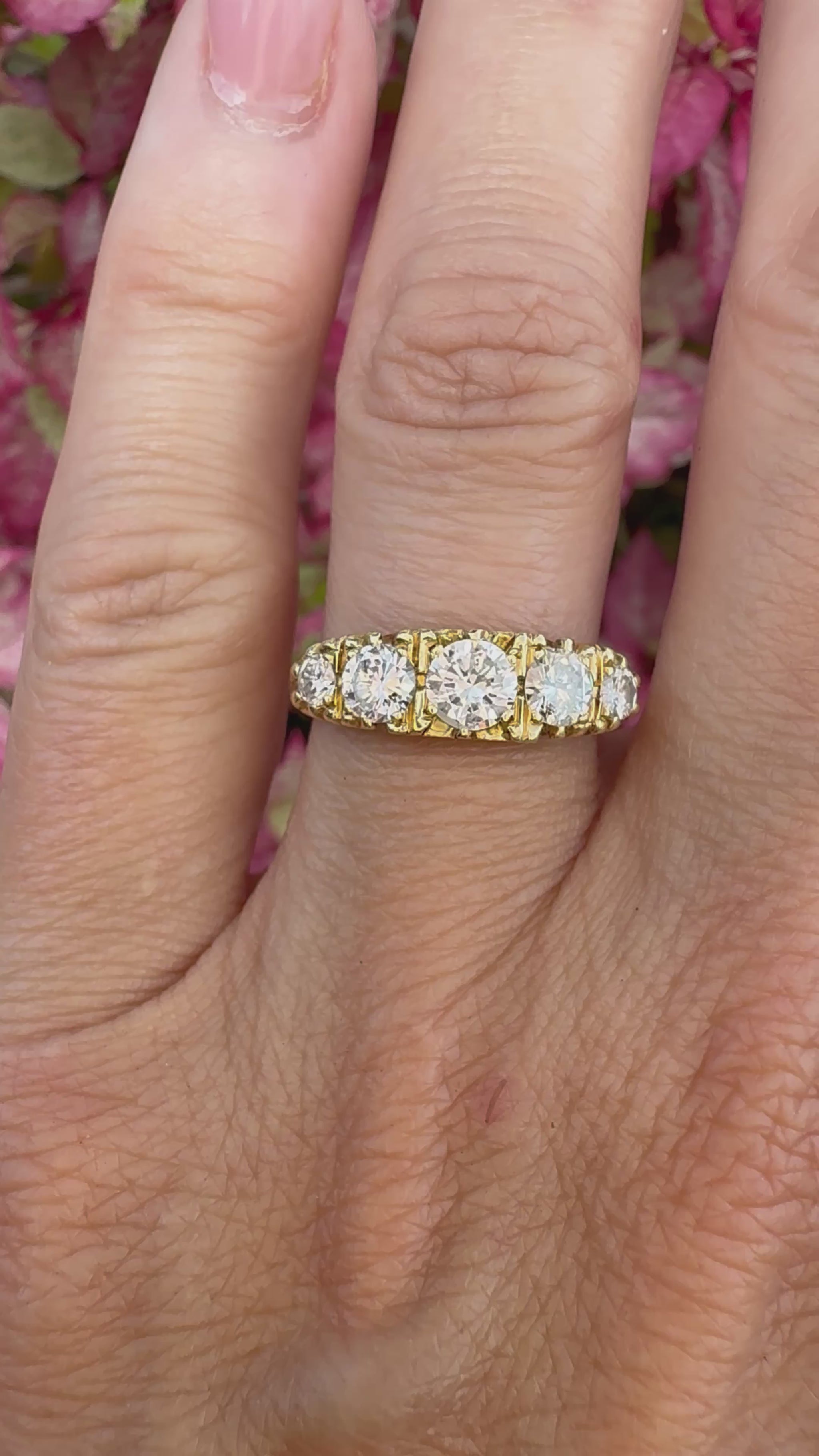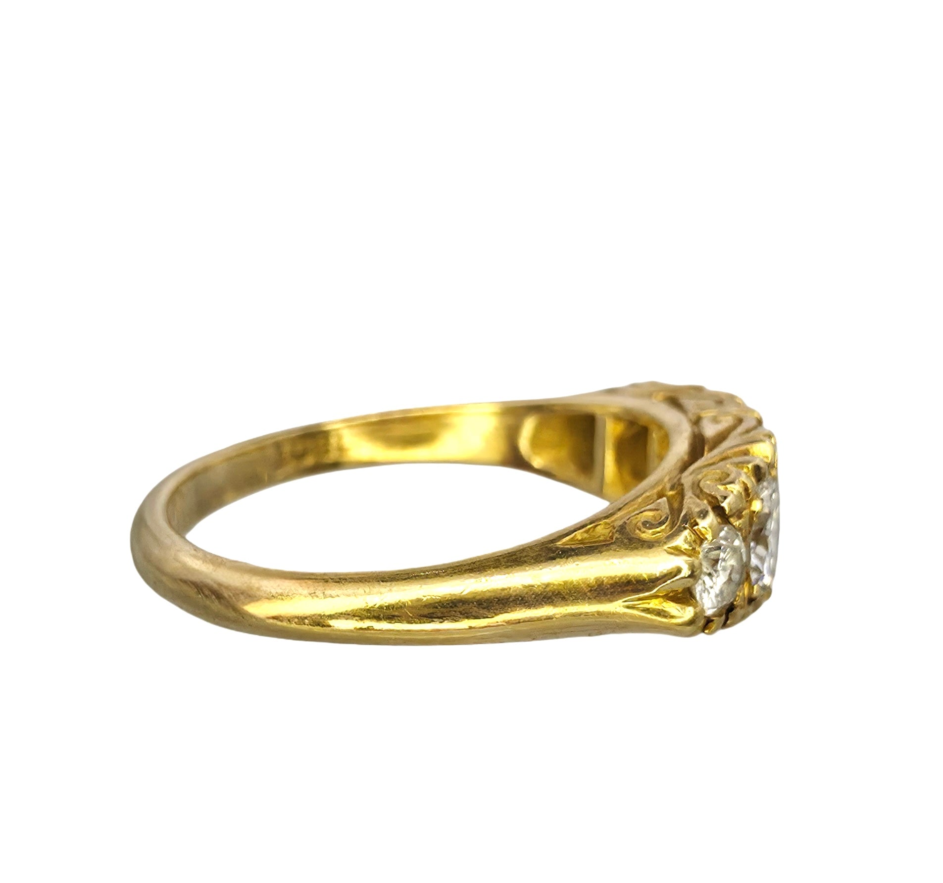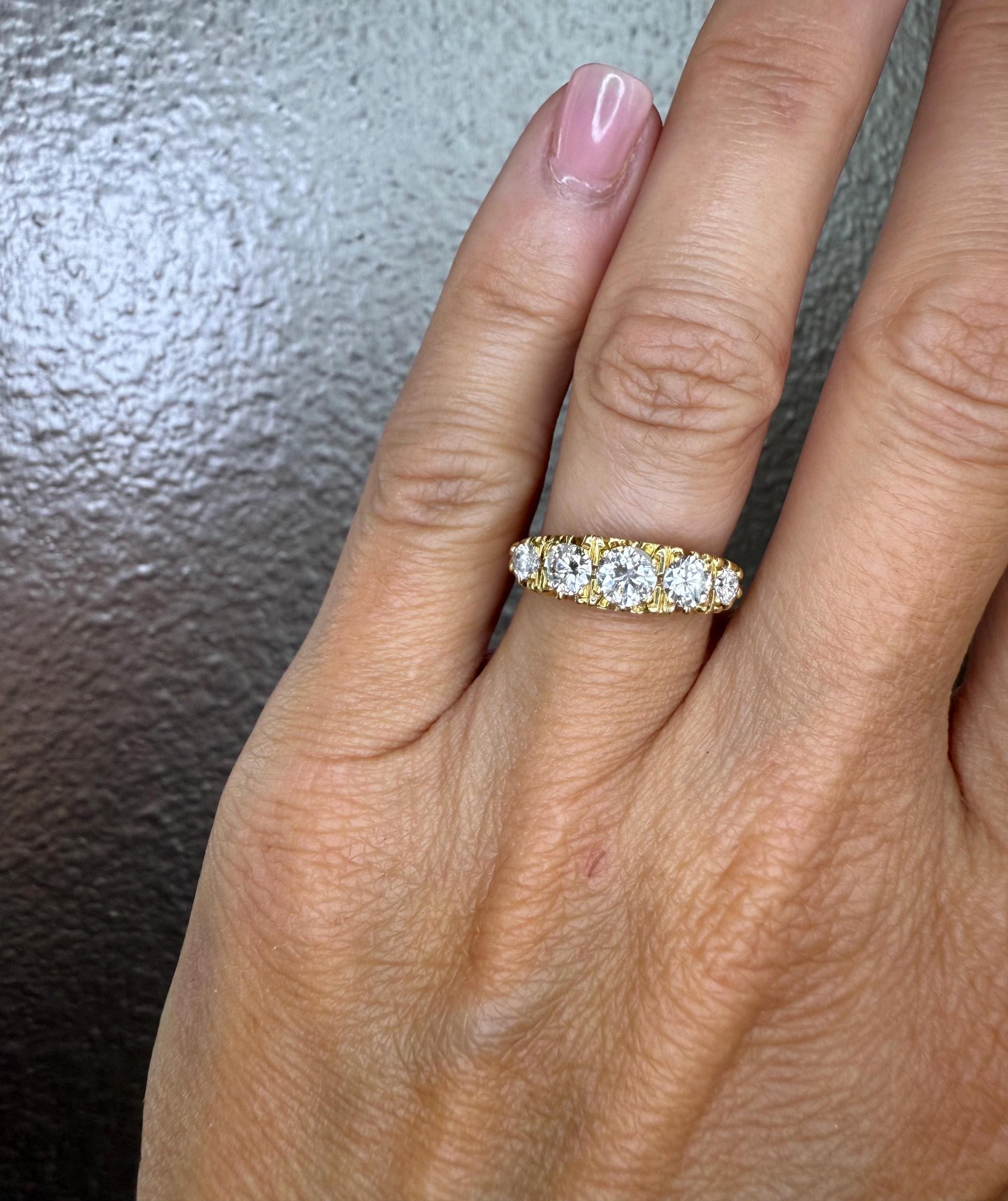 A stunning vintage 5 stone diamond ring set in a Victorian setting. The setting is solid 18K buttery yellow gold. The diamonds are very white for this style ring, they don't have any warmth like most rings of this style. The color of the diamonds are estimated at F/G and are brilliant cut with clarity VS-SI2. The tcw of the diamonds are 1.5 carats with the center stone measuring 5mm and the side stones 4.5mm . The ring is a size 7 and can be sized up or down . This ring stacks well with both modern and vintage rings.