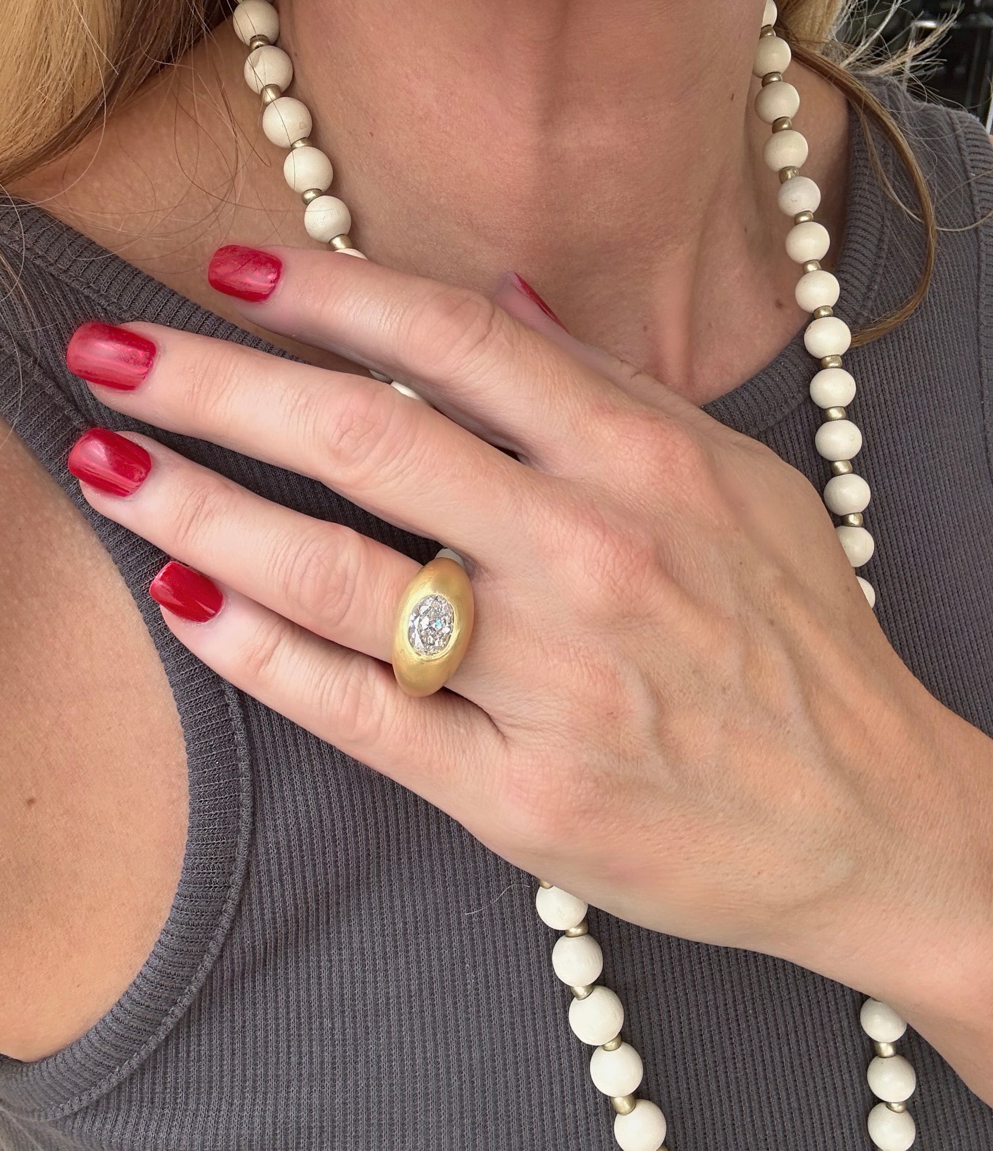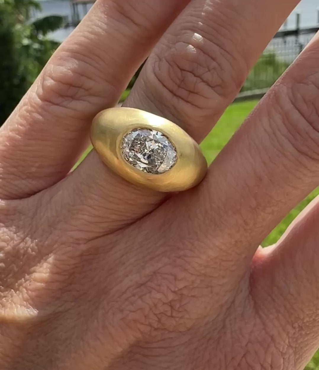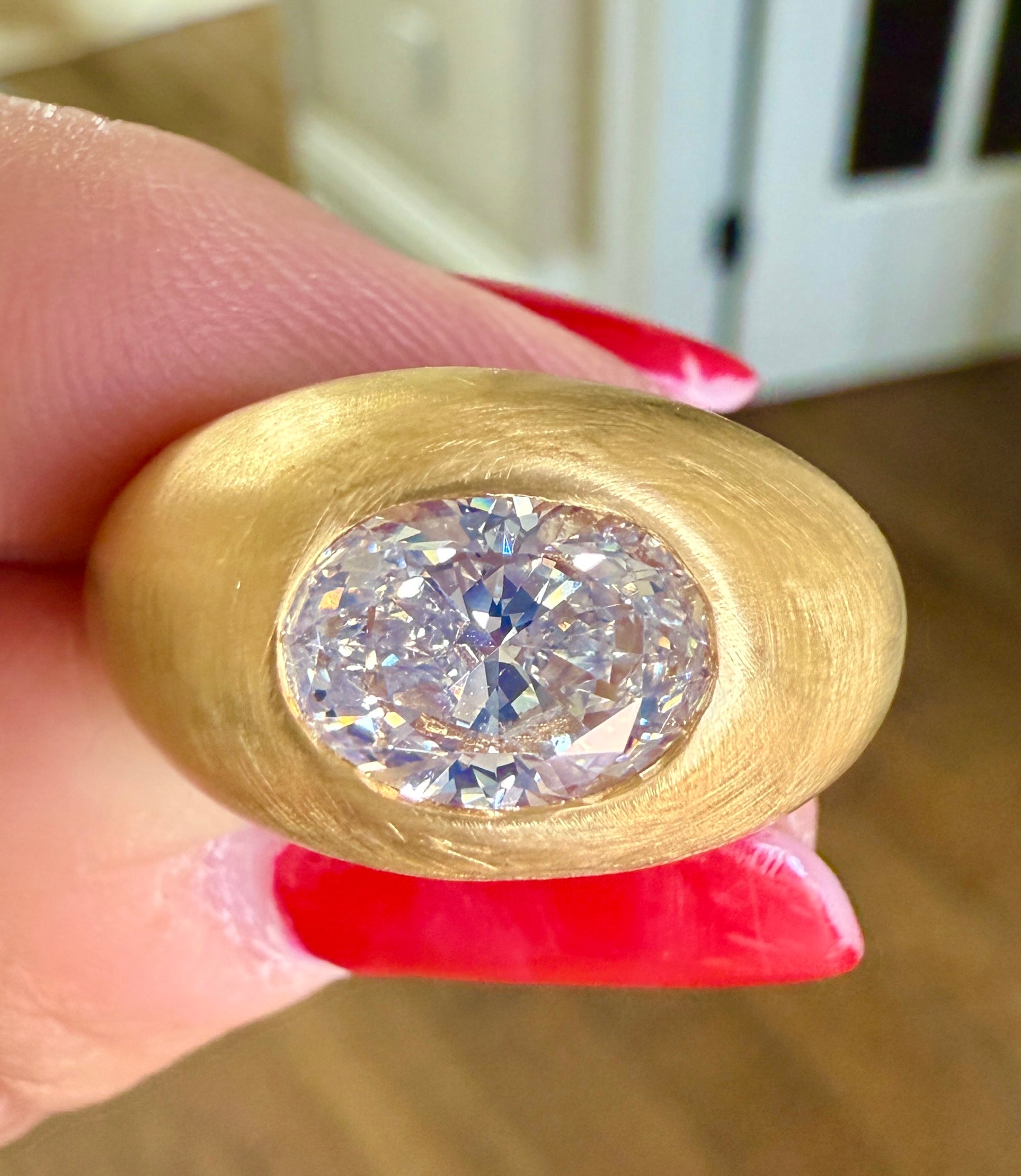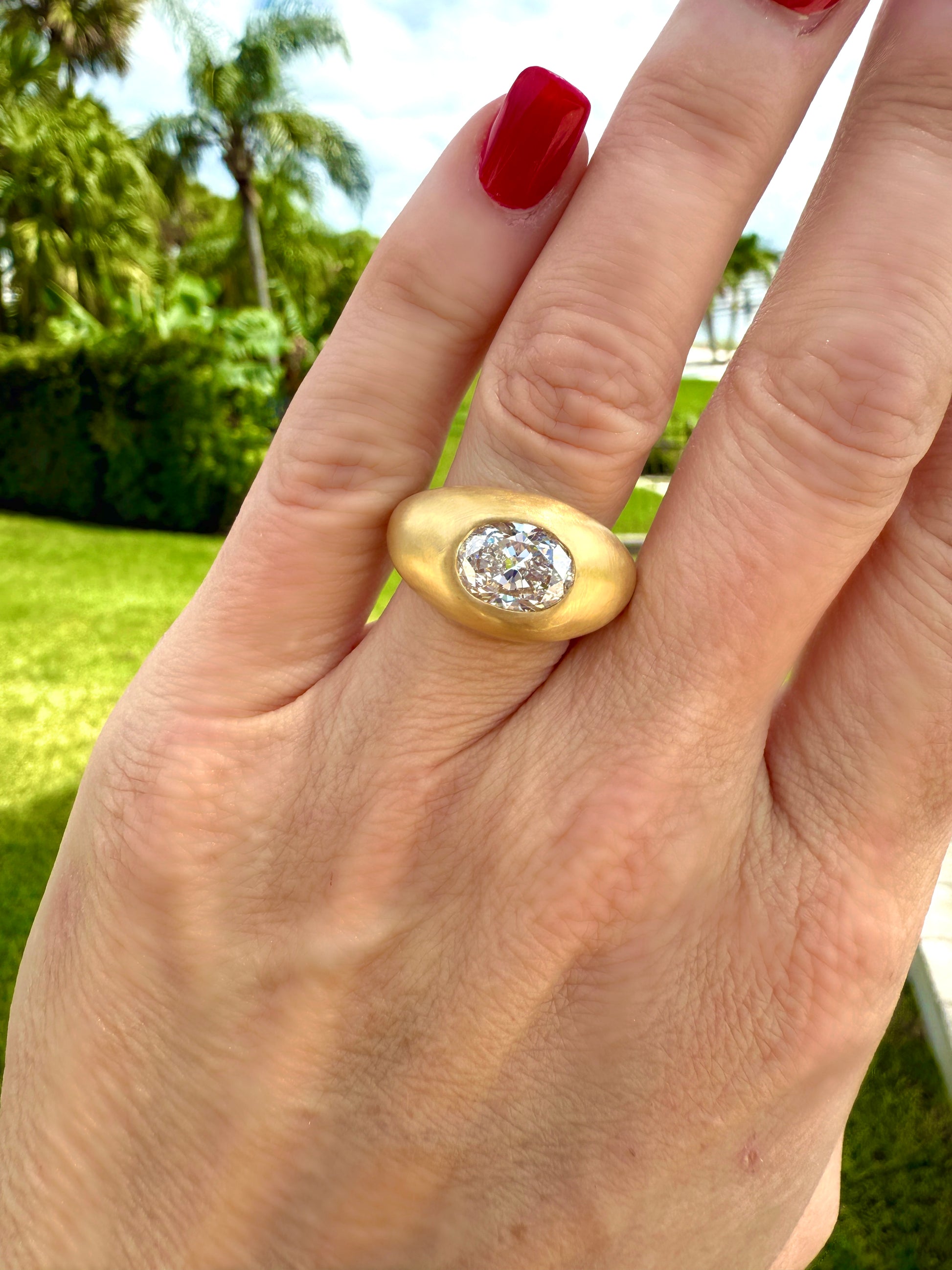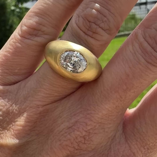 The ultimate Diamond Donut Gypsy Ring. The first ring I made sold very quickly. This diamond is so unique I decided to set her in 22K gold. It’s a 2.3 carat beautiful Oval Brilliant Diamond. Measuring 10mm x 7.4mm. The K color gives it slight warmth and dimension so that it almost feels antique, but the fluorescence makes this diamond very white at the same time. Slight color changes are noticeable in different lighting.