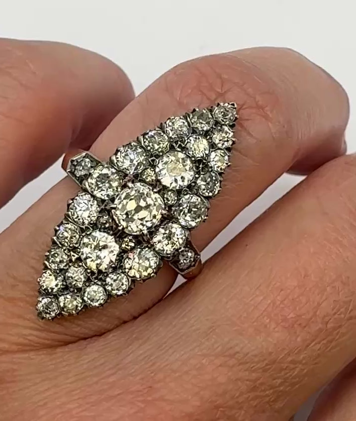 A beautiful Navette ring. This ring is exceptional quality. There are 31 old mine cut diamonds in total with an approximate total weight of 3.1 tcw. The largest of the three principal stones measures approximately 5.2 mm x 4.95 mm and the two surrounding stones measure 4.5mm x 4.5mm . The setting is silver topped on 18K gold. The oxidized silver gives the most beautiful dimension against the white diamonds. The clarity of the diamonds are excellent, the principal diamond is eye clean, even under a loupe. The surrounding diamonds are SI1-I1. The only hallmarks on the band read 18K. This ring was purchased in Barcelona .