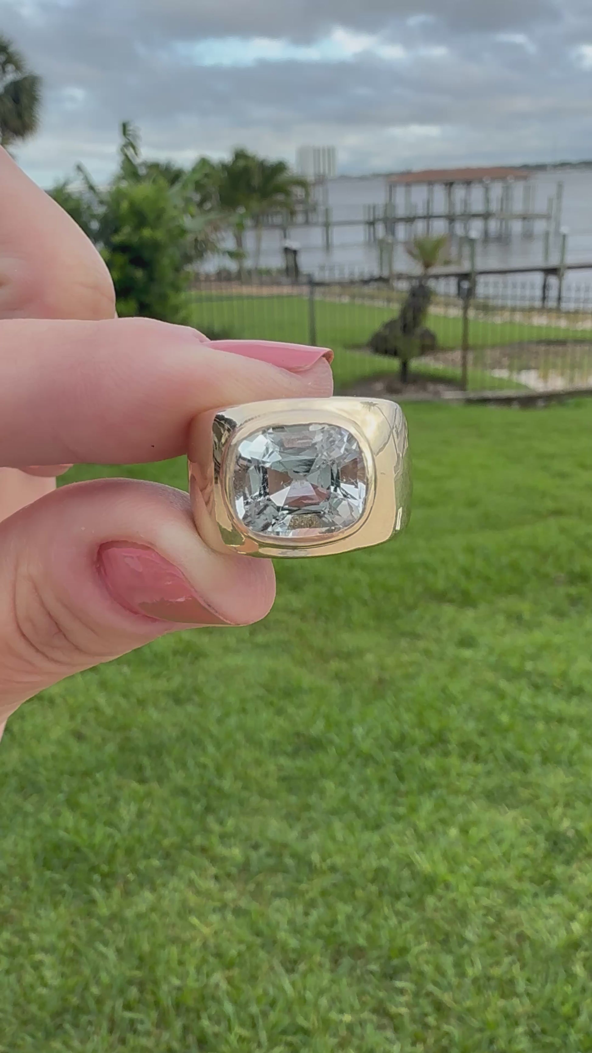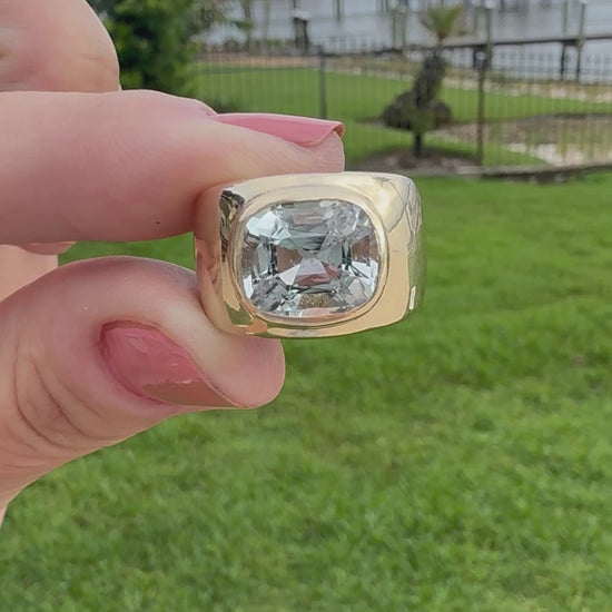 The aquamarine is cushion cut with VS clarity and no treatment. The stone measures 11.53 x 9.65 x 7.3 . It is currently a size 7, but can be sized . The ring weighs over 17.8 grams of 14k gold.