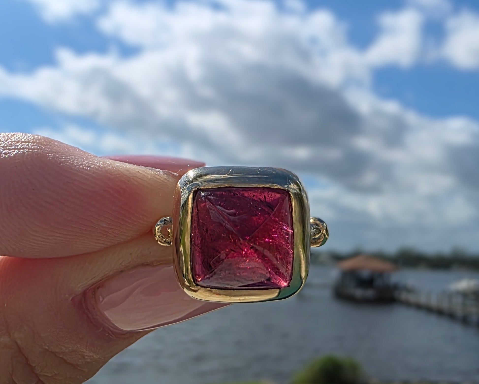 A beautiful natural rubellite sugarloaf tourmaline. This ring was hand carved from wax and casted by the Lost Wax Technique. The setting is solid 14K yellow gold. The stone is approx 6 carats and 14mm x 14mm in size