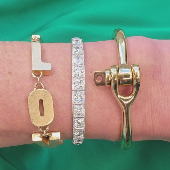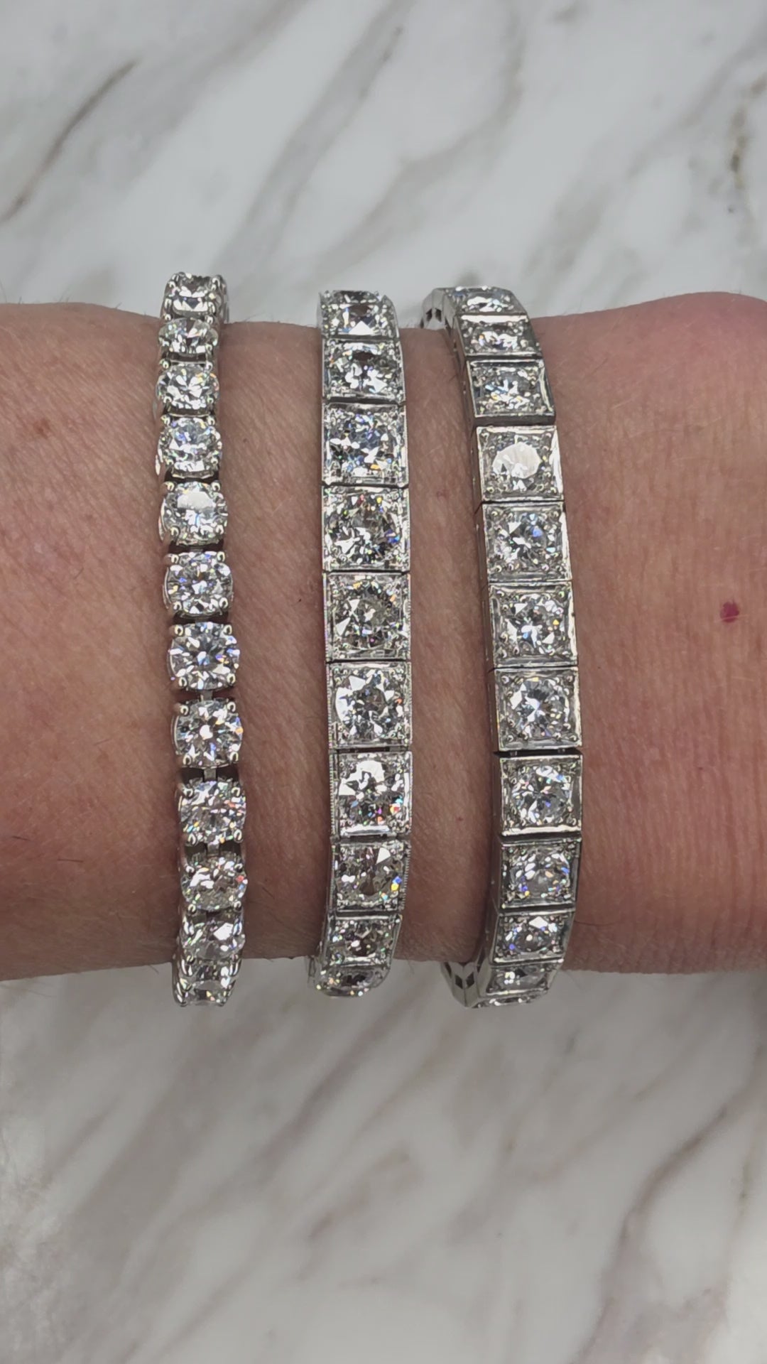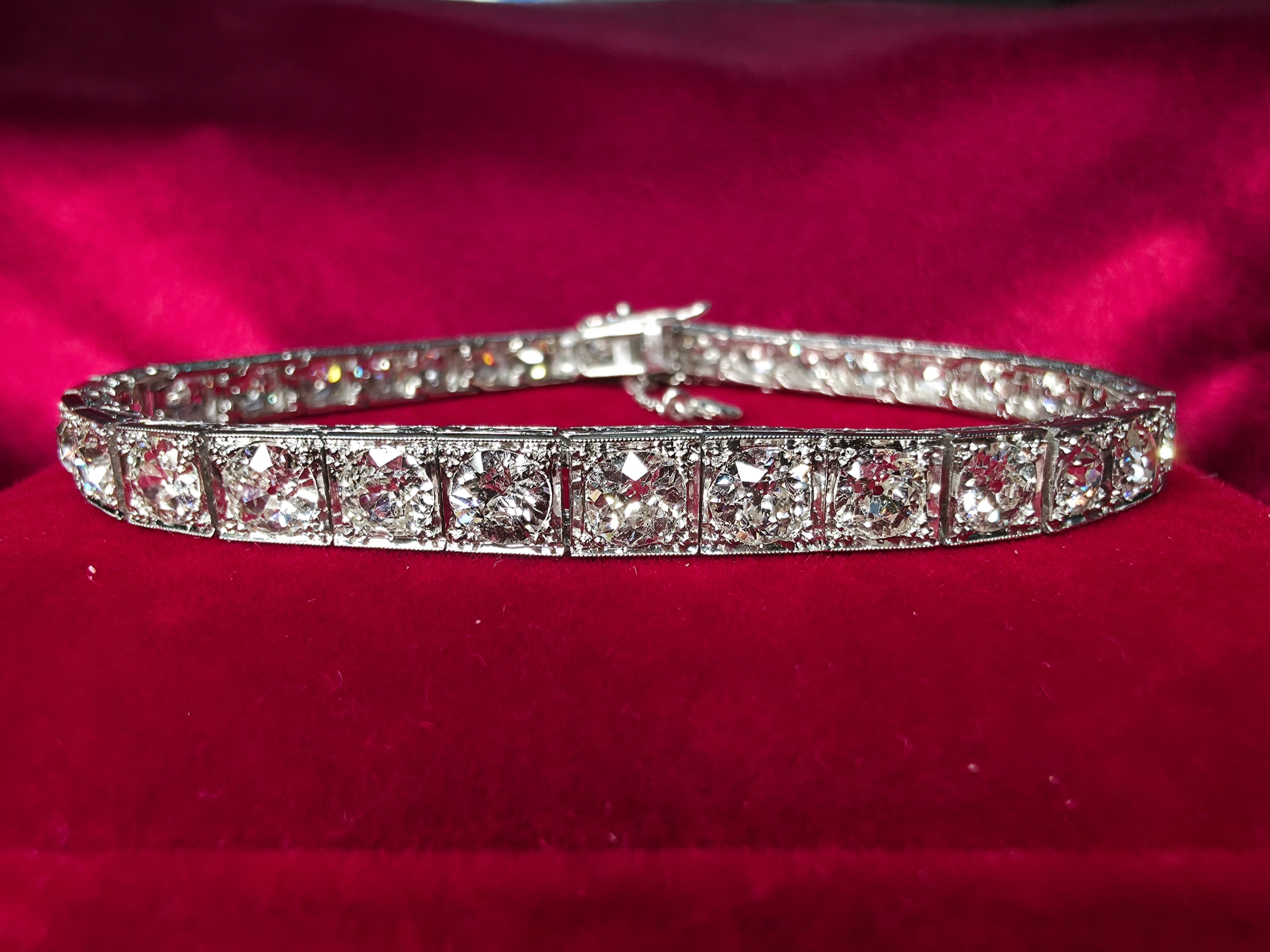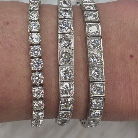 The bracelet is set with 34 beautifully matched old European–cut diamonds, with a total estimated weight of 8.5 carats. The diamonds display exceptionally white color, estimated at H–I, with outstanding brilliance. Clarity and cut are equally impressive, with most stones estimated in the VS1–SI range. The clasp is in excellent condition and is complemented by a spring clasp safety chain, ensuring both security and wearability. For customization, the bracelet may be resized for $150, and the safety chain may be removed with the addition of figure-eight safety clasps for $100.