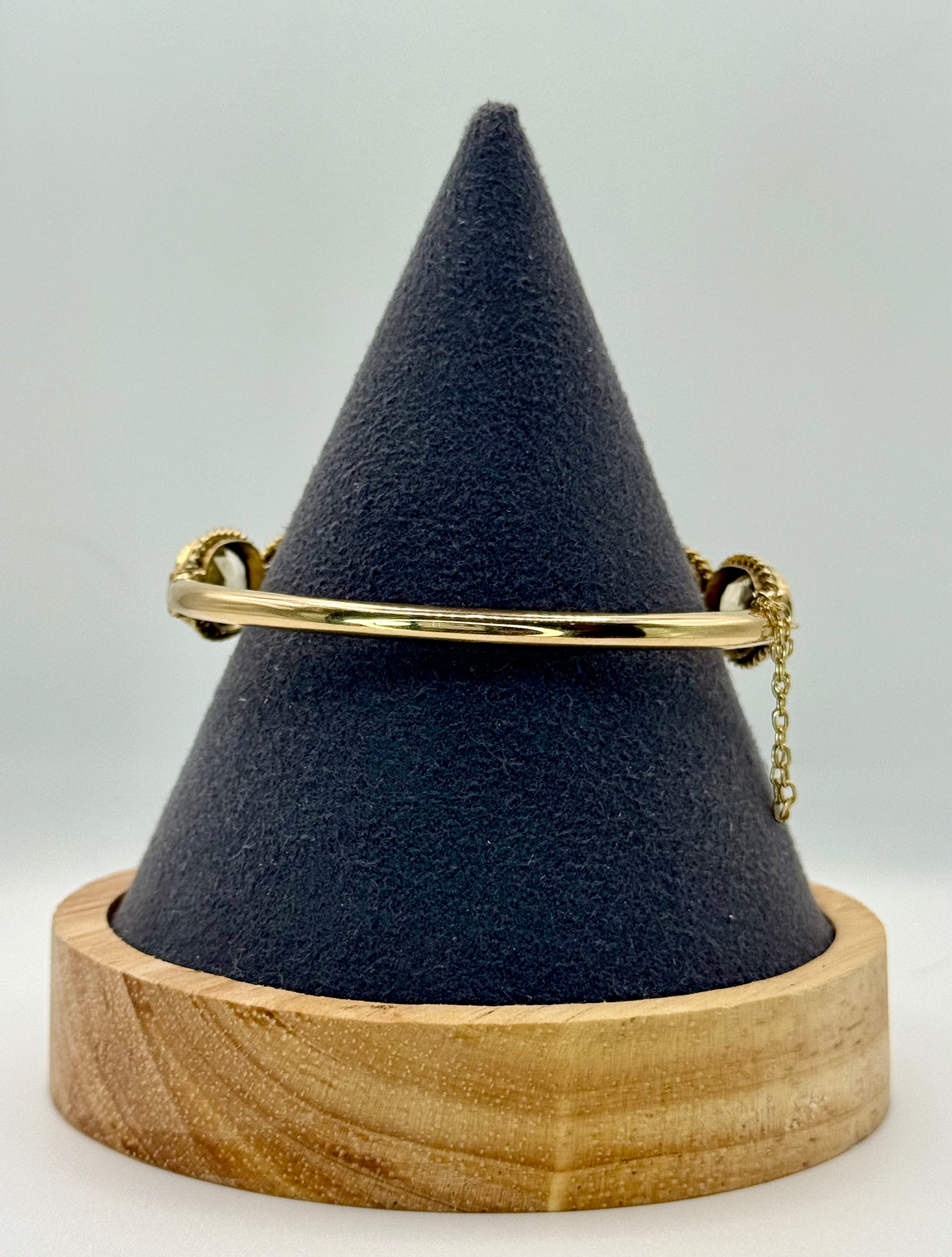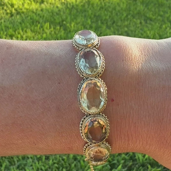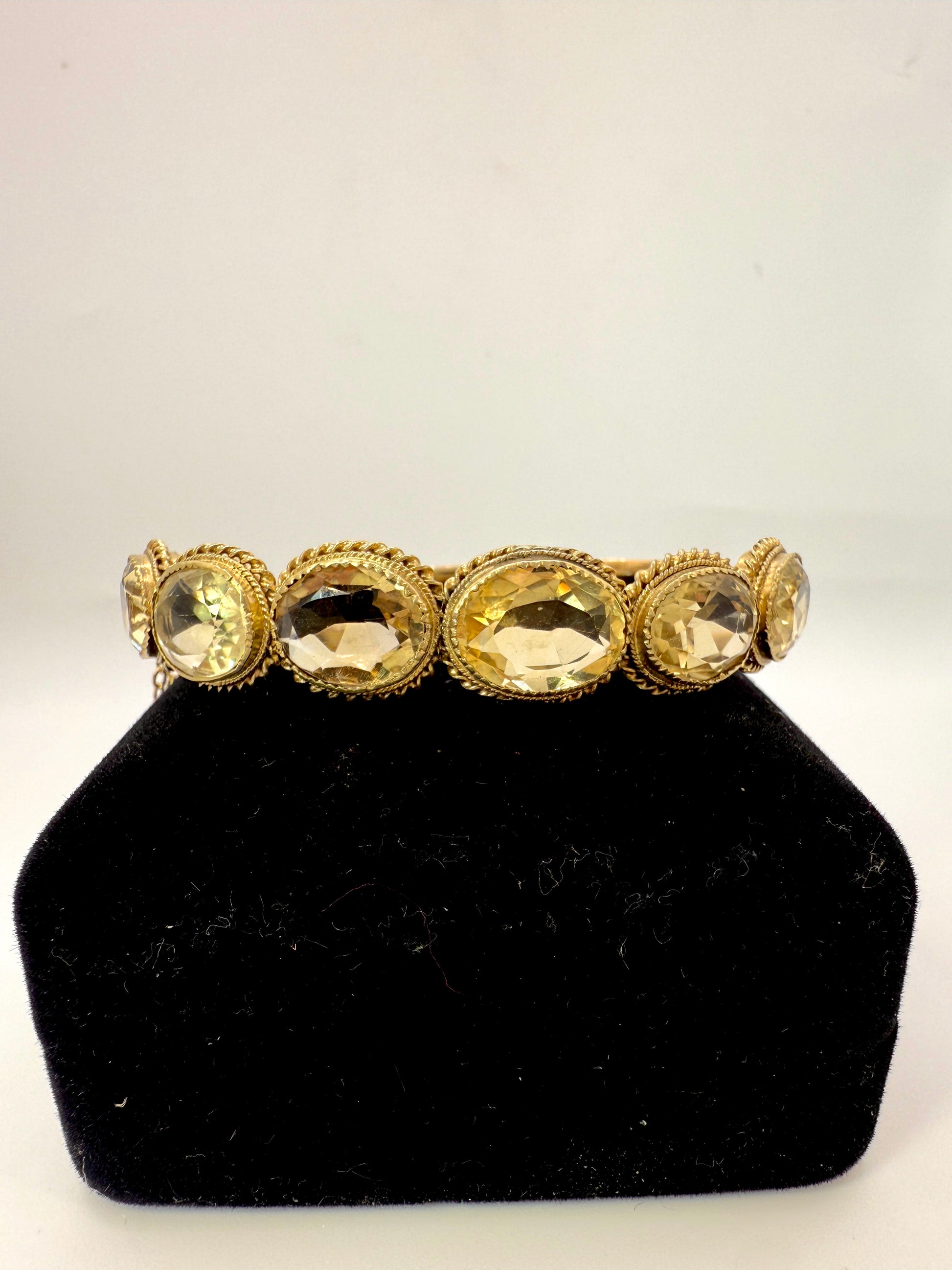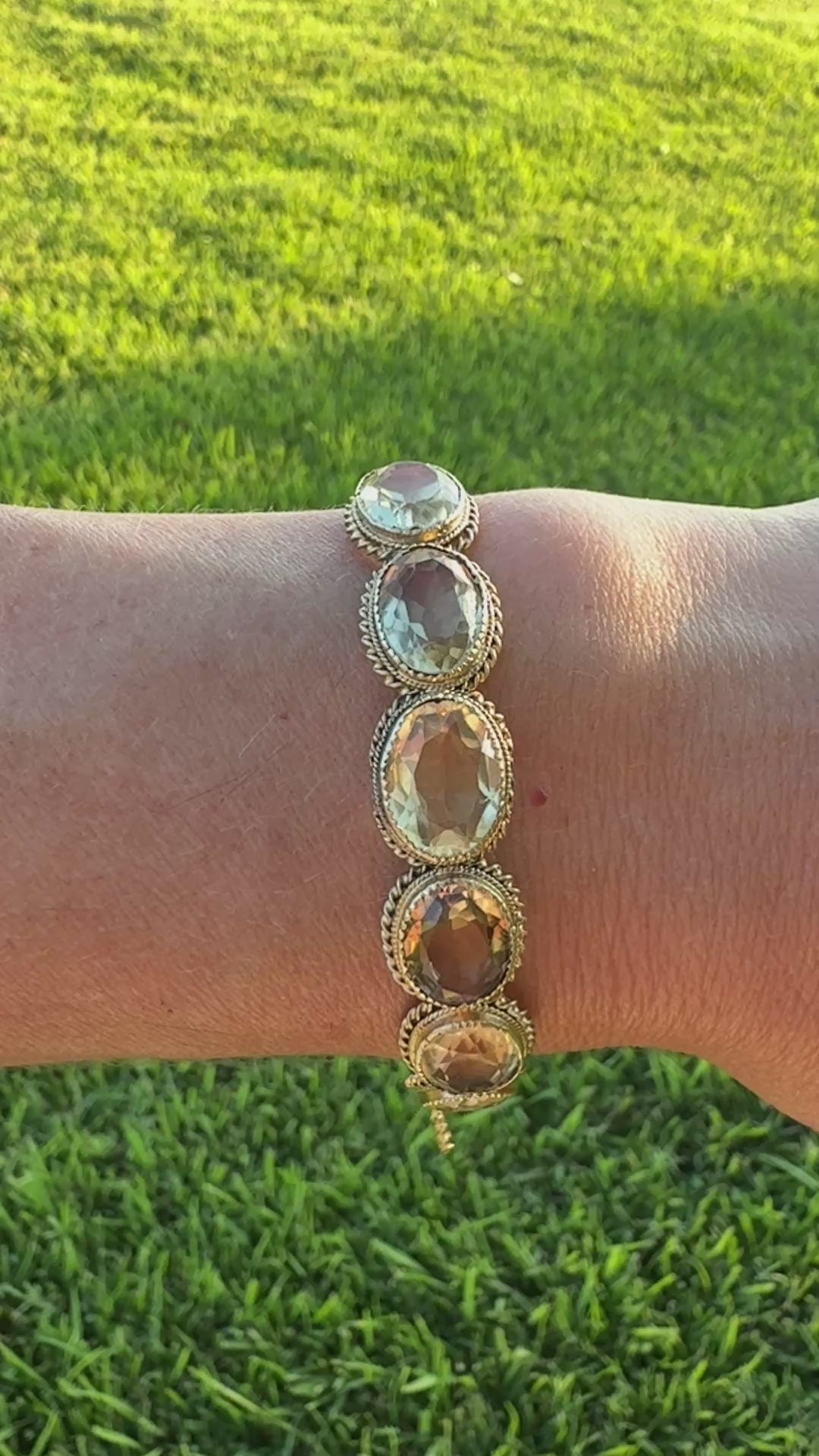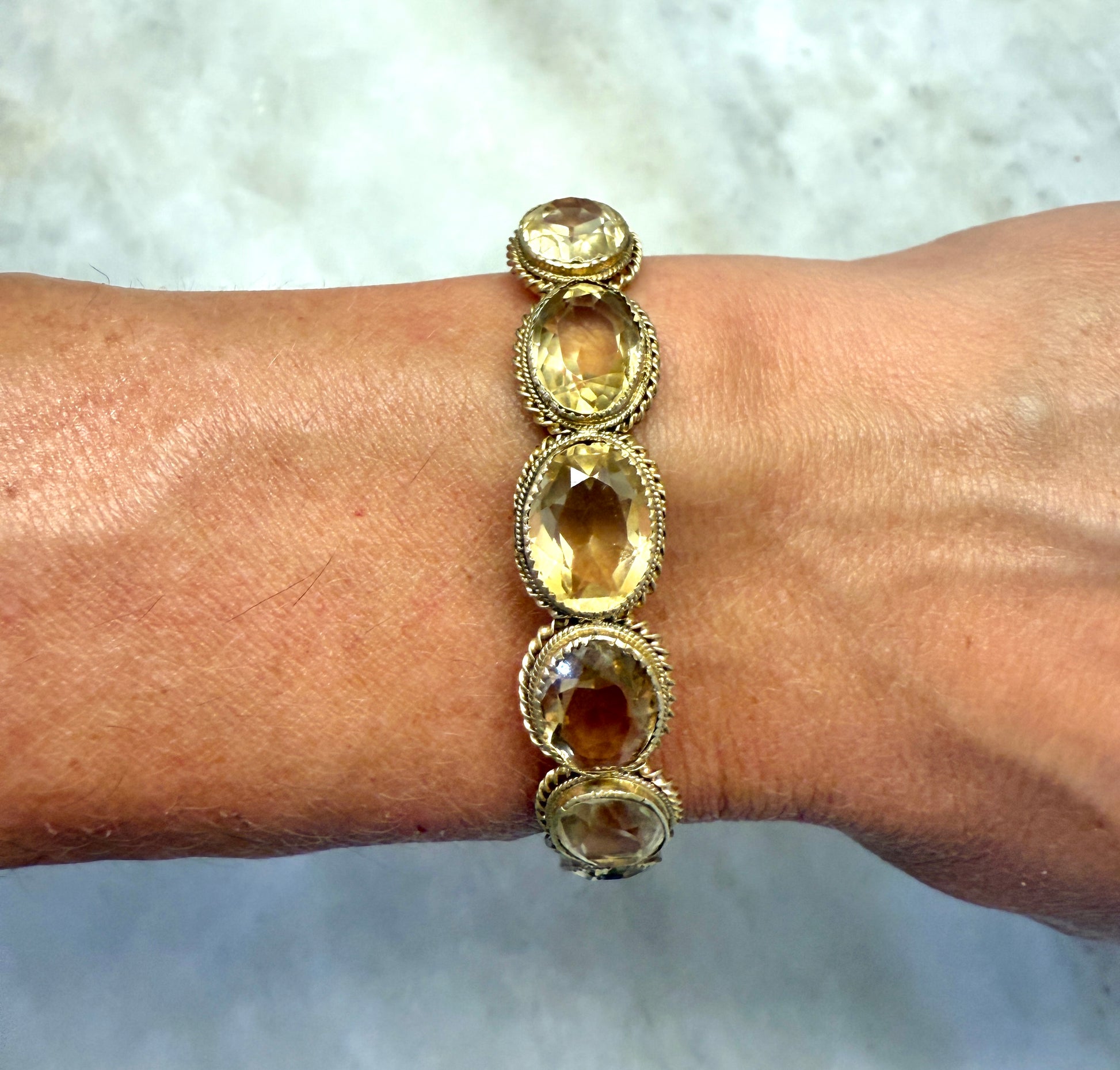 An antique citrine bangle comprised of 6 oval citrine stones in a milgrain bezel setting, with a rope border. No Hallmarks but testing 15k gold. The citrines average 5 carats each , for a total of 30 carats approximately. Very good condition for the age of the bangle. Additional photos and videos upon request