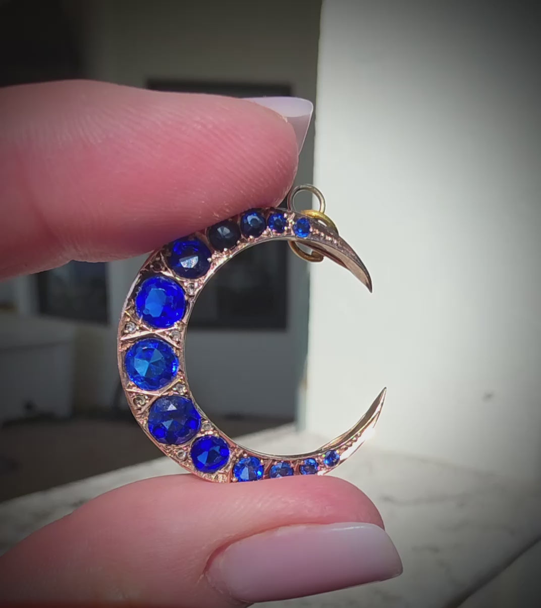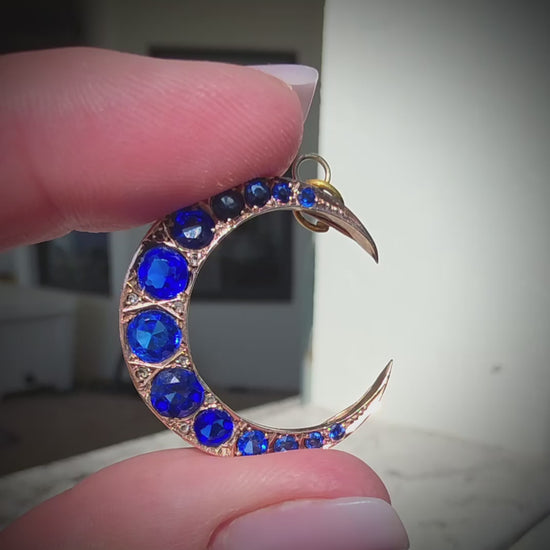 A beautifully converted antique crescent brooch. The brooch has a stunning electric blue color. It is comprised of 13 Blue paste stones and small rose cut diamonds. The setting is 9K gold and it measures 30mm across. This pendant was imported from England.