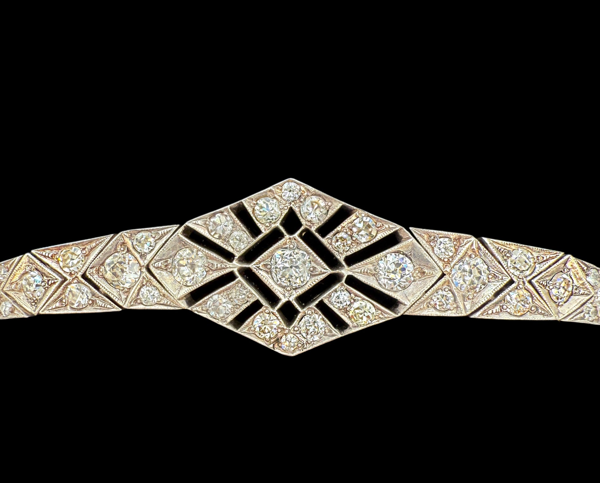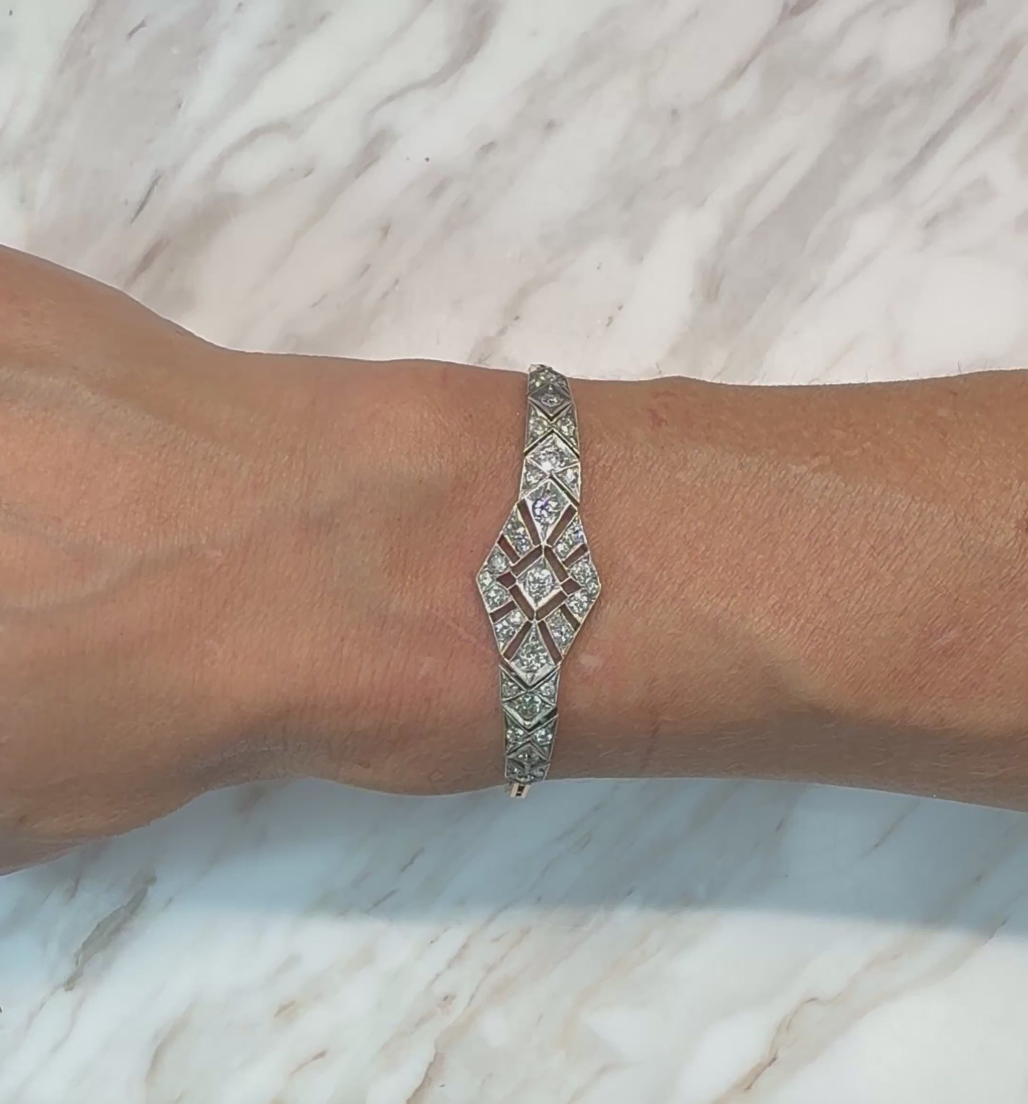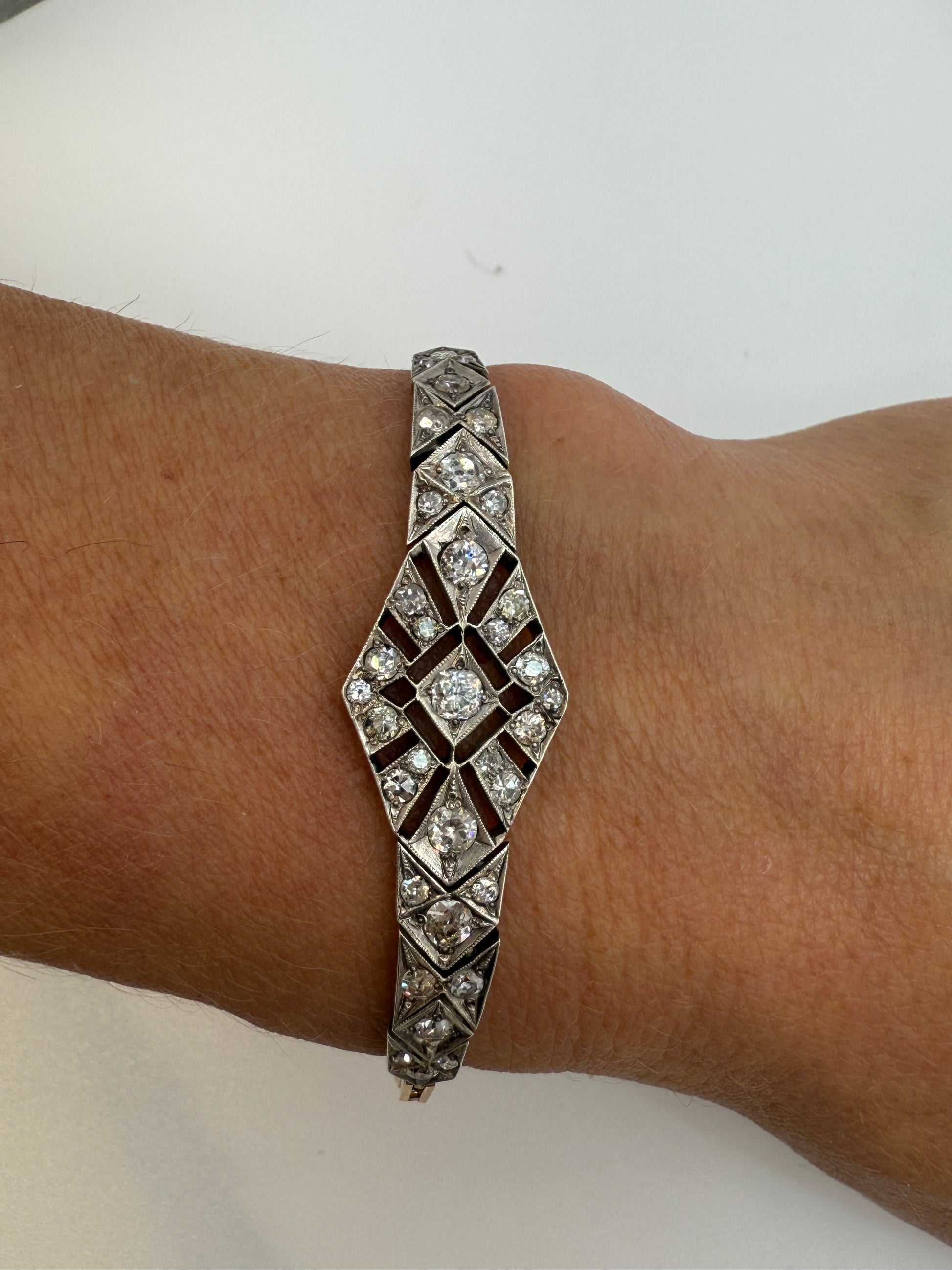 A beautiful vintage diamond bracelet. This bracelet dates back to the early 20th century (early 1900’s) . The diamonds are a combination of Old European and Old Mine cut. The largest stone in the center measures a little over 3.4 mm’s and is a beautiful old mine cut. The other diamonds vary in size and cut from 3.4mm’s to 1mm. The stones vary in color but are generally white and clean.