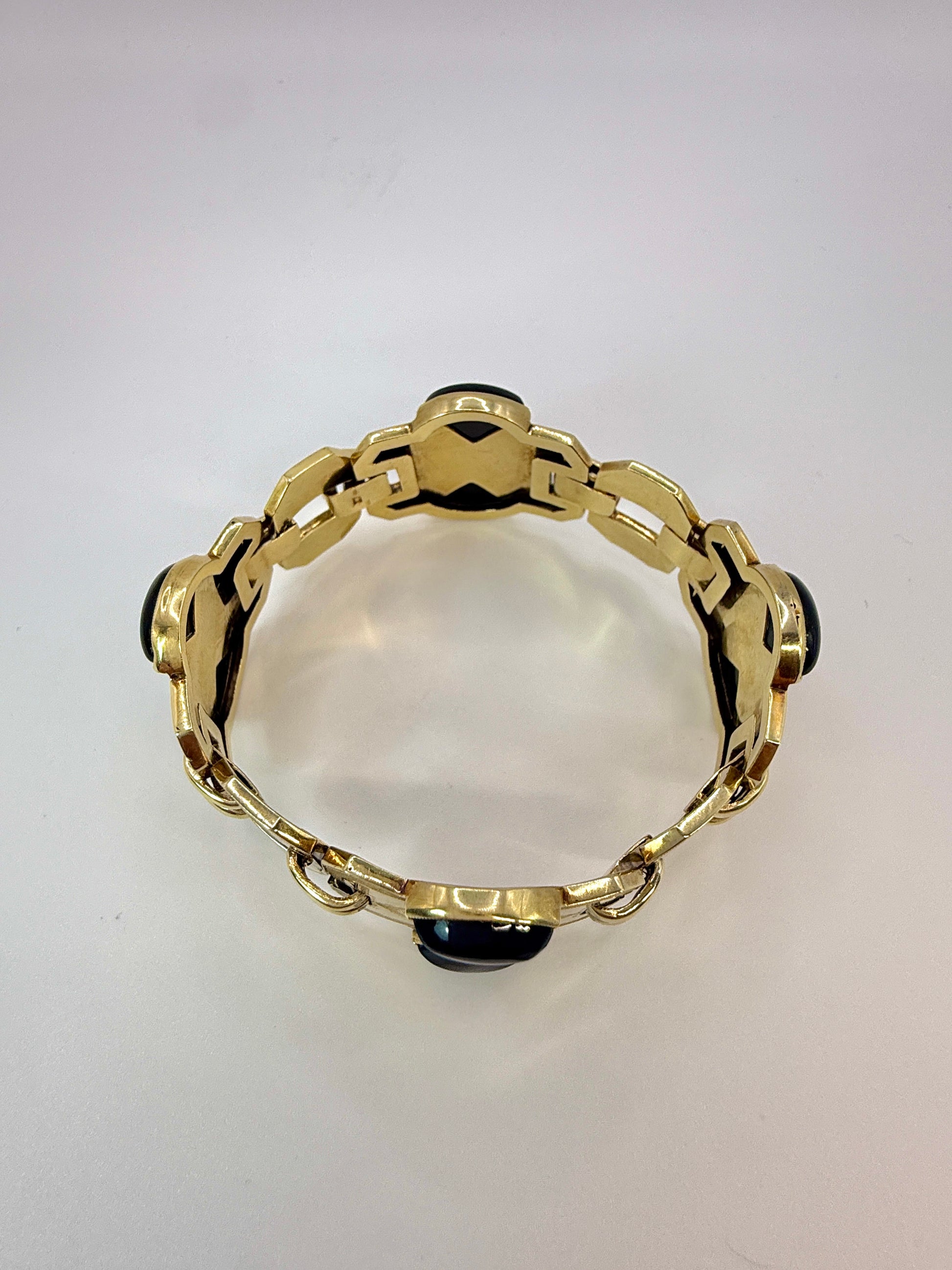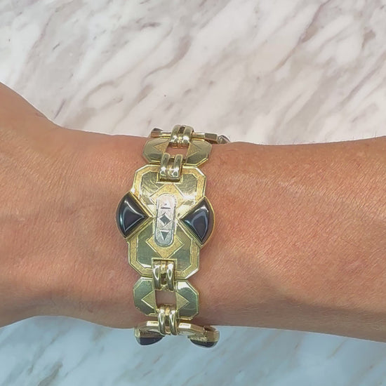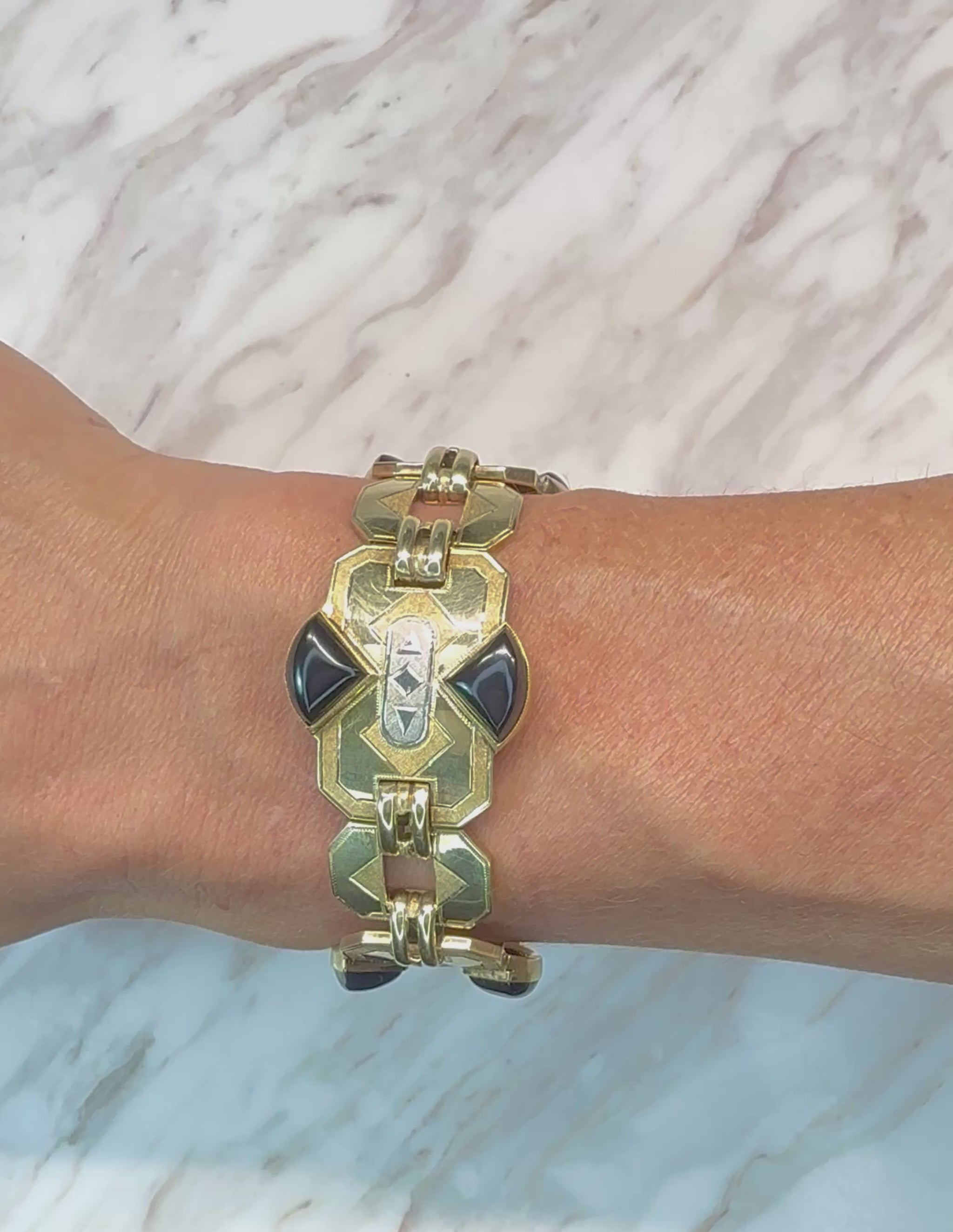 This art deco bracelet is adorned with 8 triangular onyx stones and crafted in alternating yellow and white gold. The length is 6.75” and the width is 1 inch. The onyx stones measure 9mm in width and and 11mm in length. The style, uniqueness, and craftsmanship of this bracelet are rare. It has a vintage and modern feel but also a little edgy .