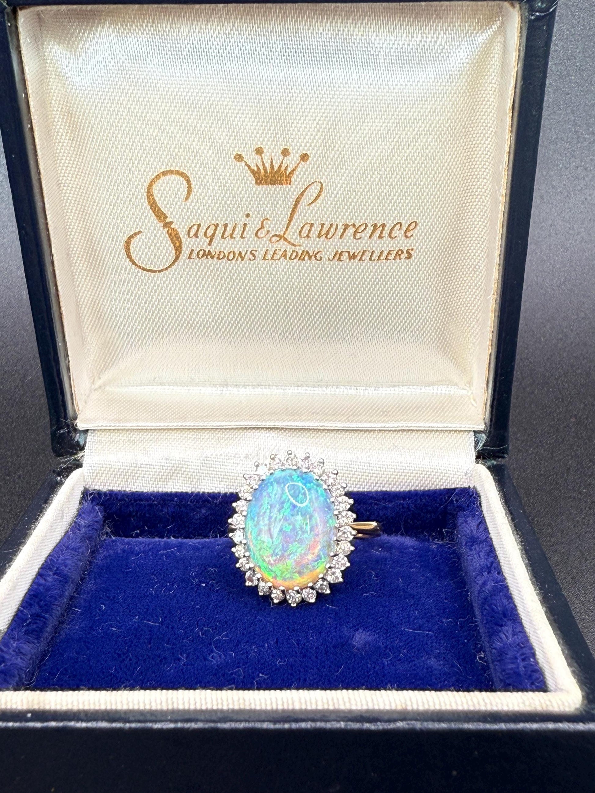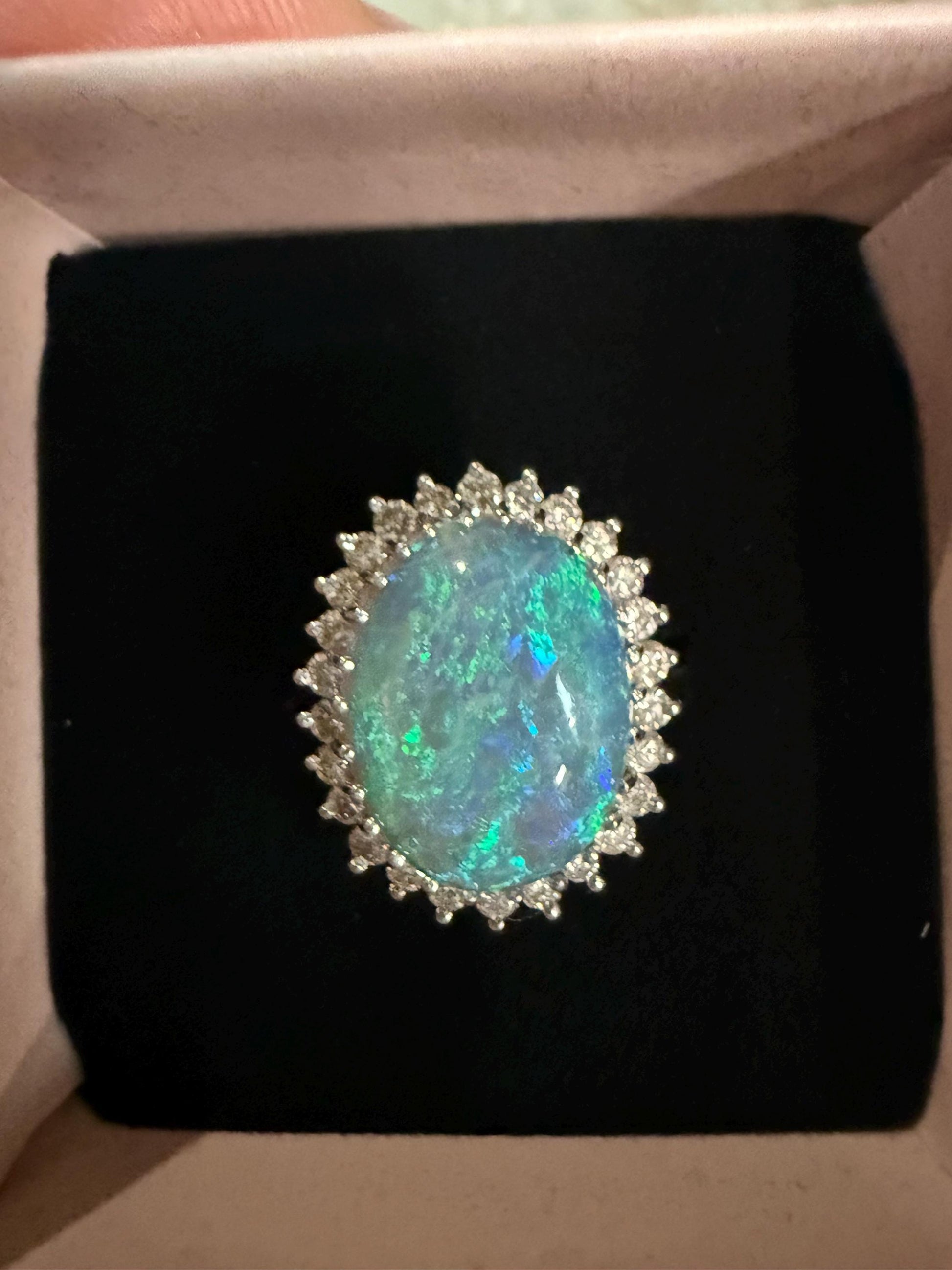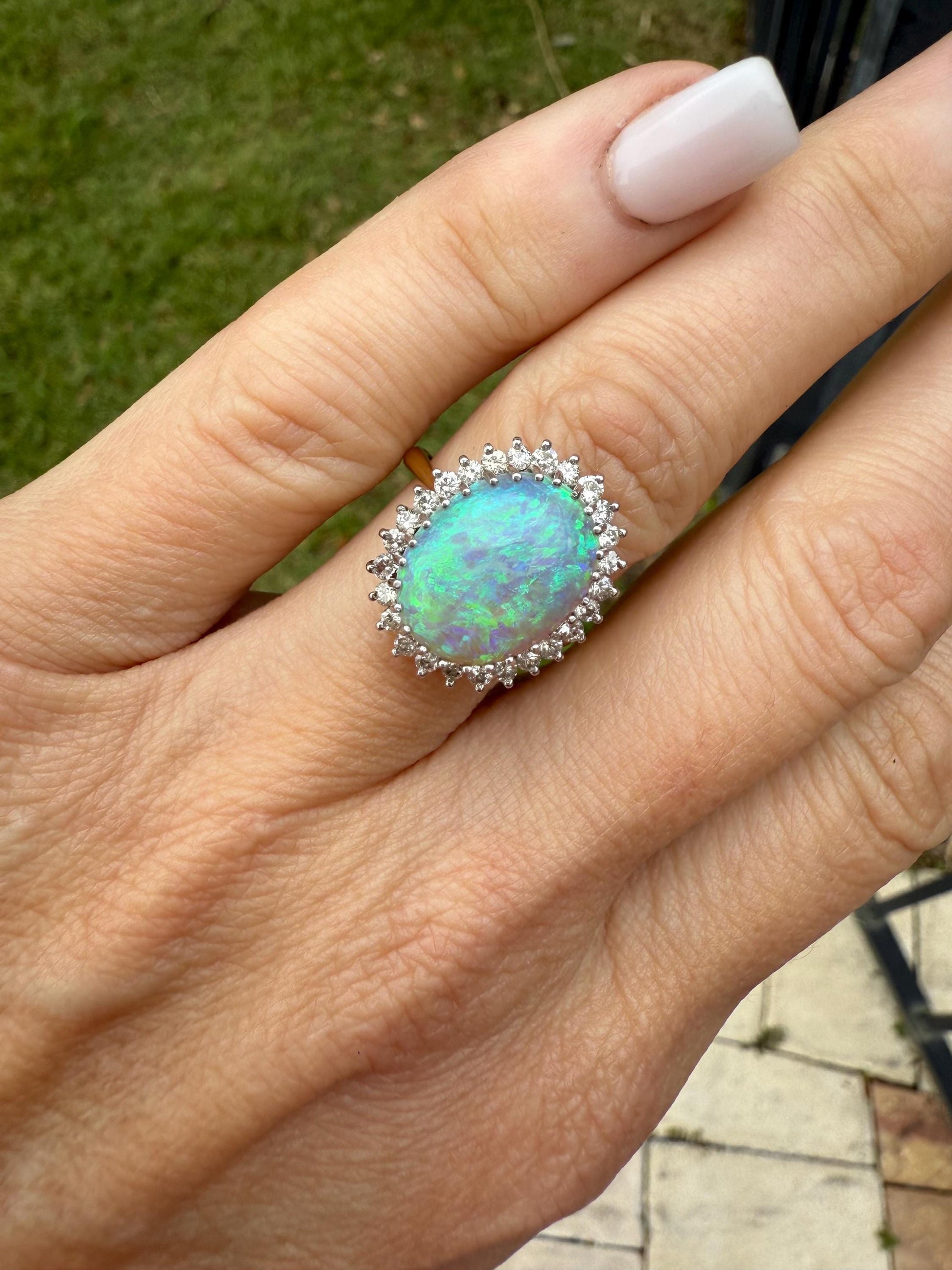 Incredible Large Australian Opal Estate ring set in 18k gold with Natural diamond halo. The Opal is so vivid and has incredible color in all lighting.
