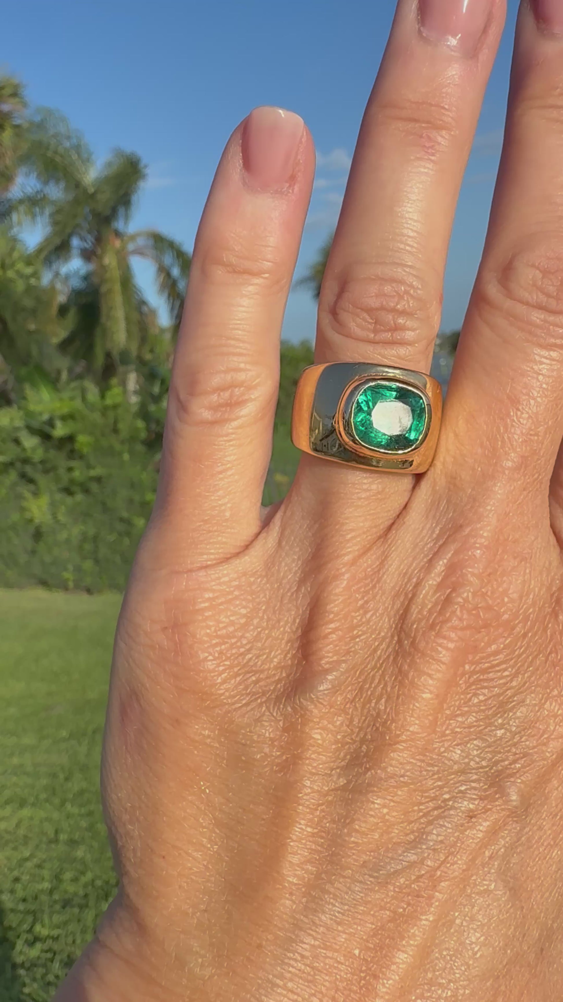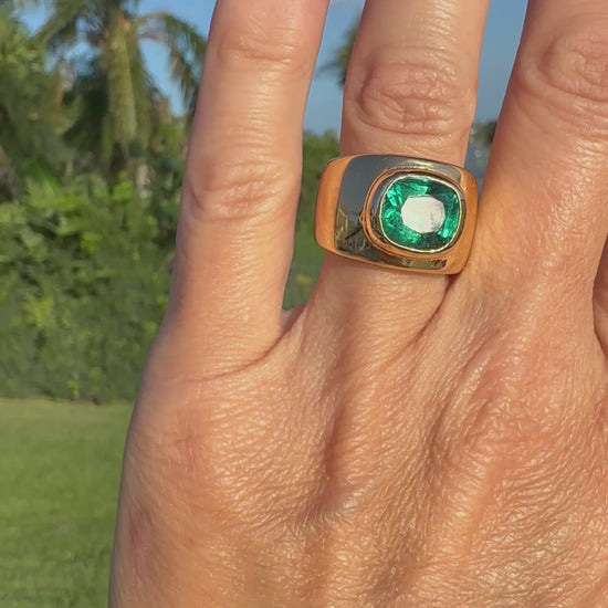 A stunning Handmade Emerald Green 4 carat Tourmaline set in 14k Raised Bezel Cigarband. The center stone weighs 4 carats and has a beautiful deep emerald green color. In direct light the stone glows a beautiful bright green. The setting is very comfortable and heavy, it weighs 18g of solid 14k gold.