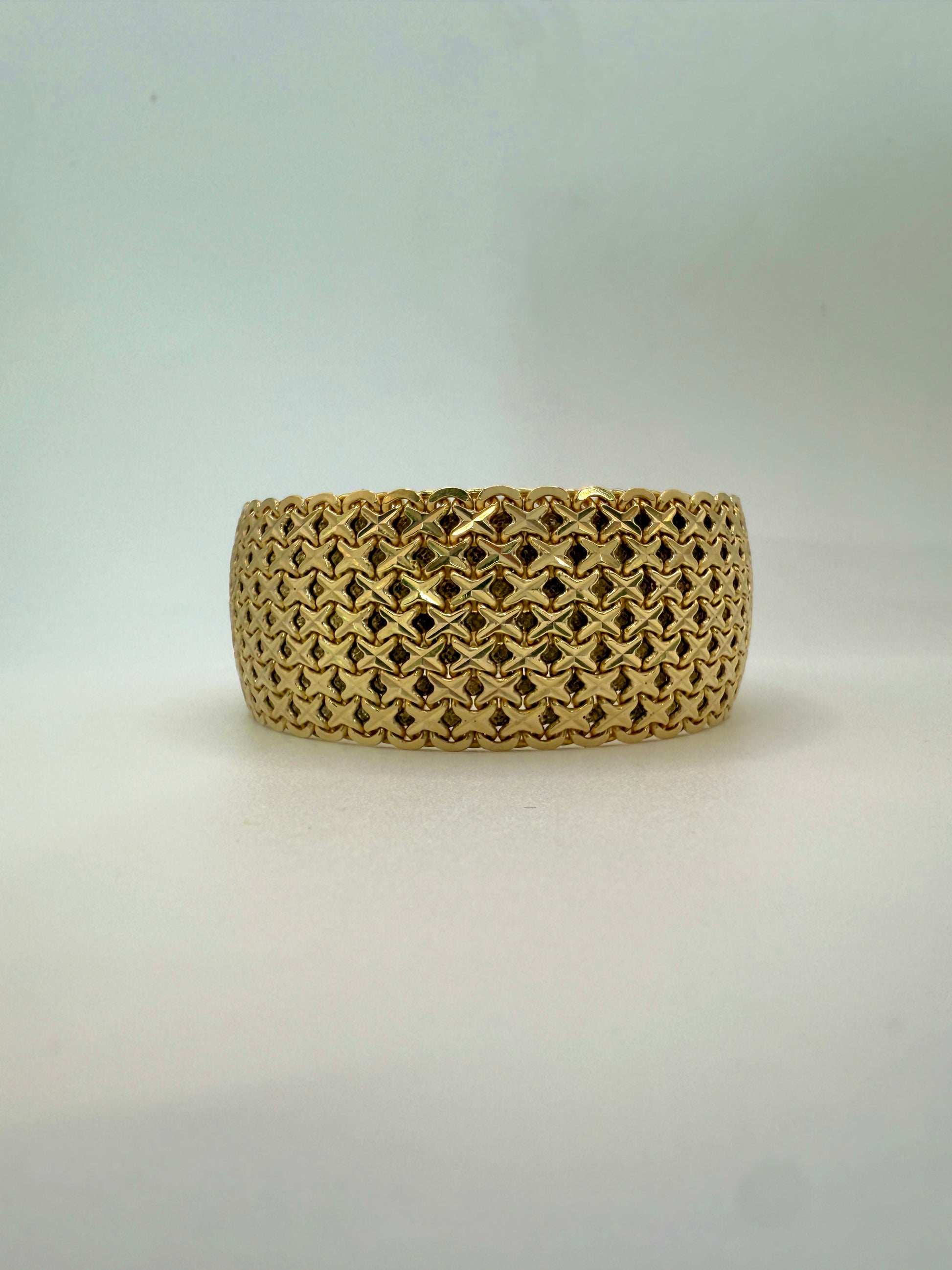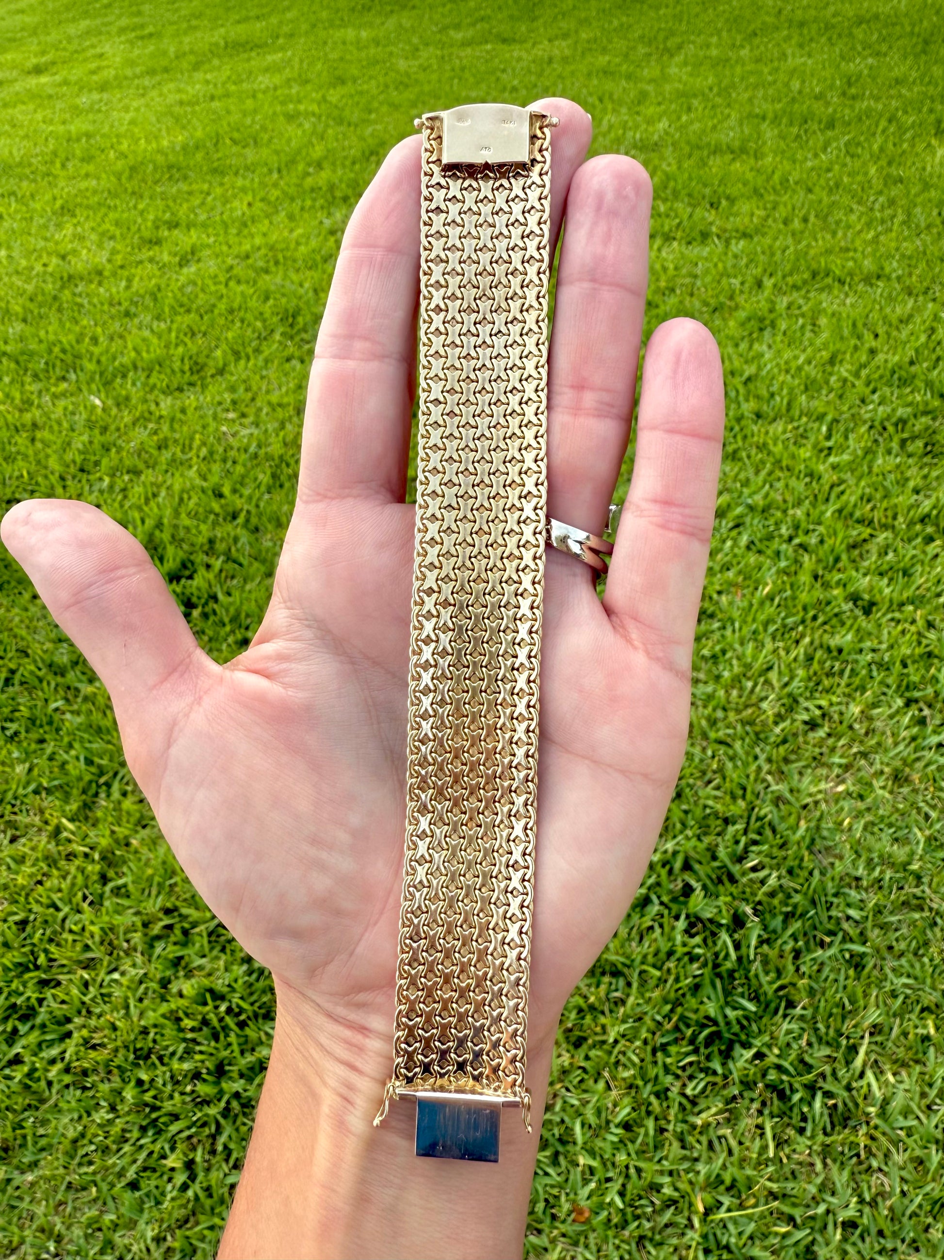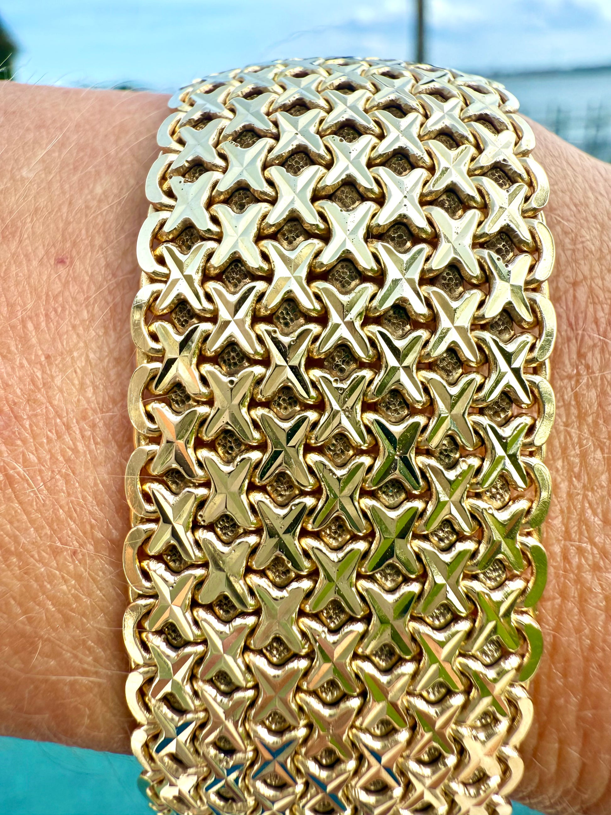 This bracelet is a heavy hitter . She weighs 64 grams of 14k Italian-made , beautifully crafted gold. Close examination of the bracelet reveals a stunning XO link pattern. The inside dimension is 6.75” and the width is 1” . This bracelet is very substantial, its slightly flexible has a slight dome appearance.