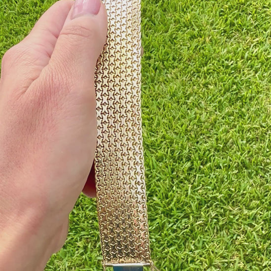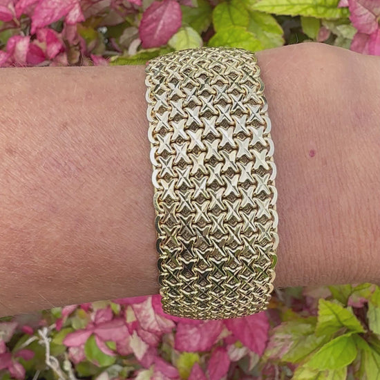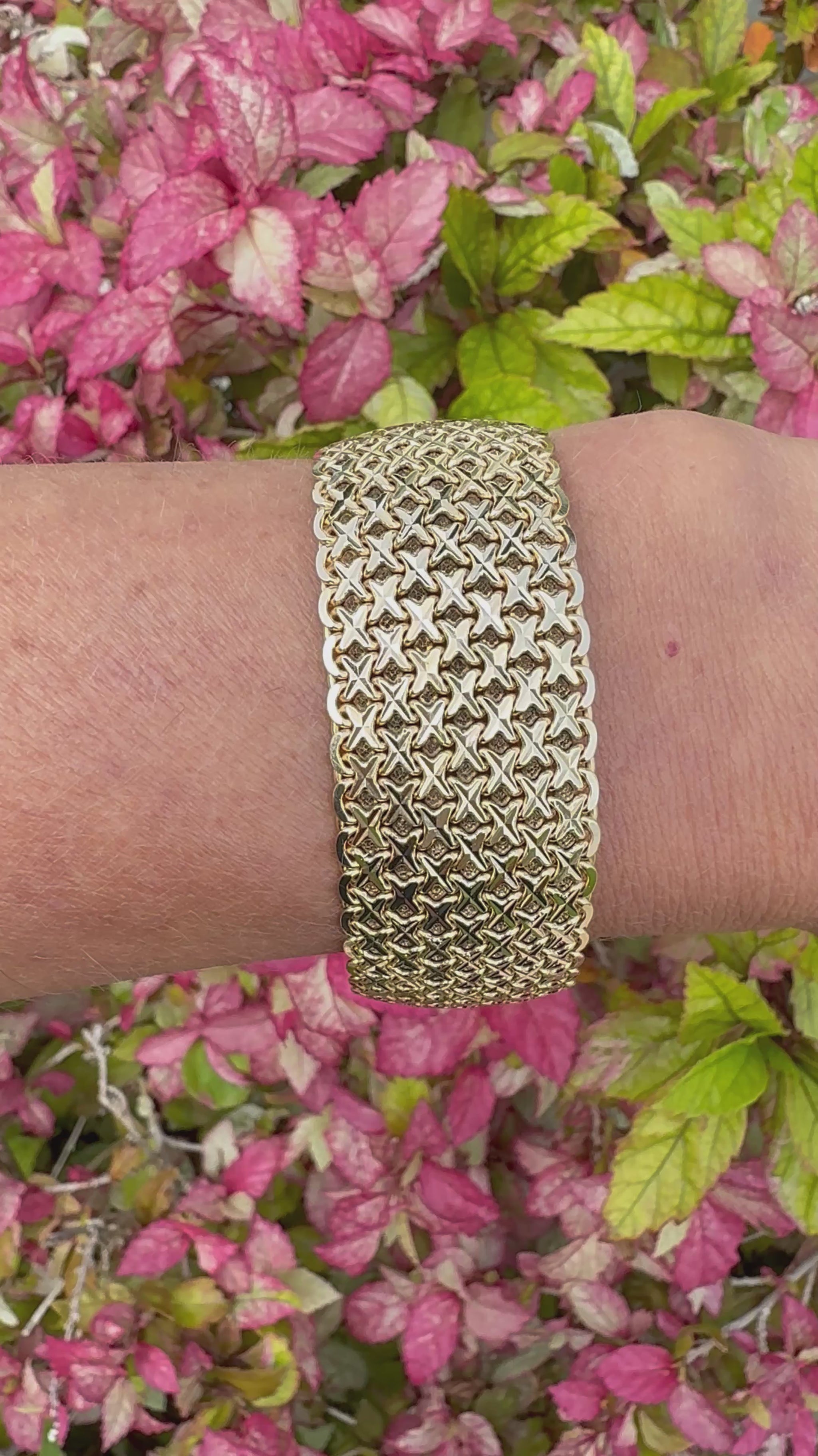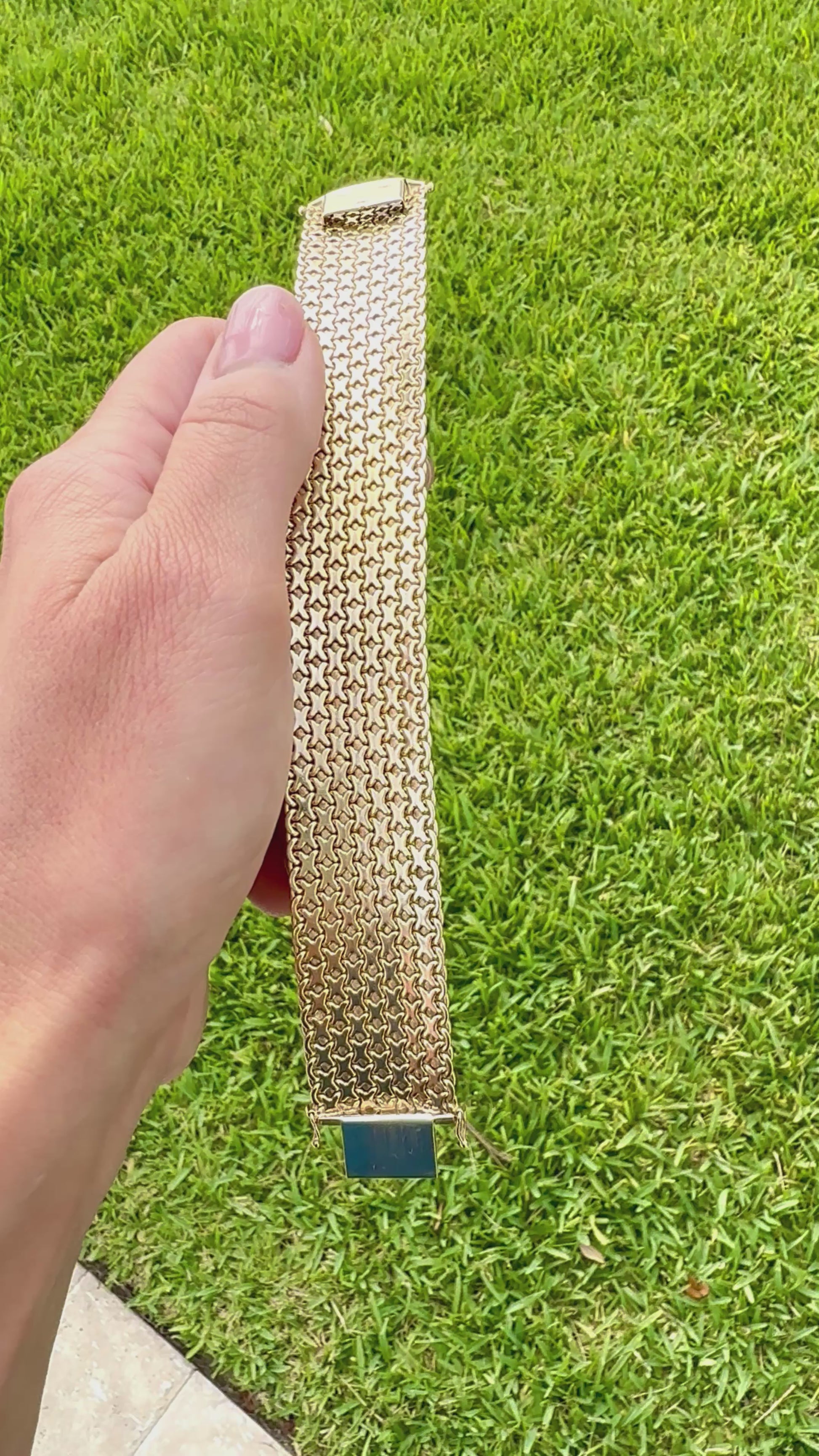This bracelet is a heavy hitter . She weighs 64 grams of 14k Italian-made , beautifully crafted gold. Close examination of the bracelet reveals a stunning XO link pattern. The inside dimension is 6.75” and the width is 1” . This bracelet is very substantial, its slightly flexible has a slight dome appearance.