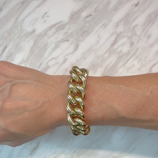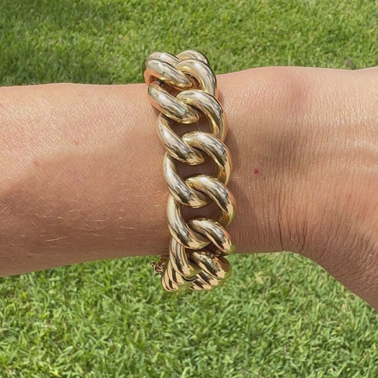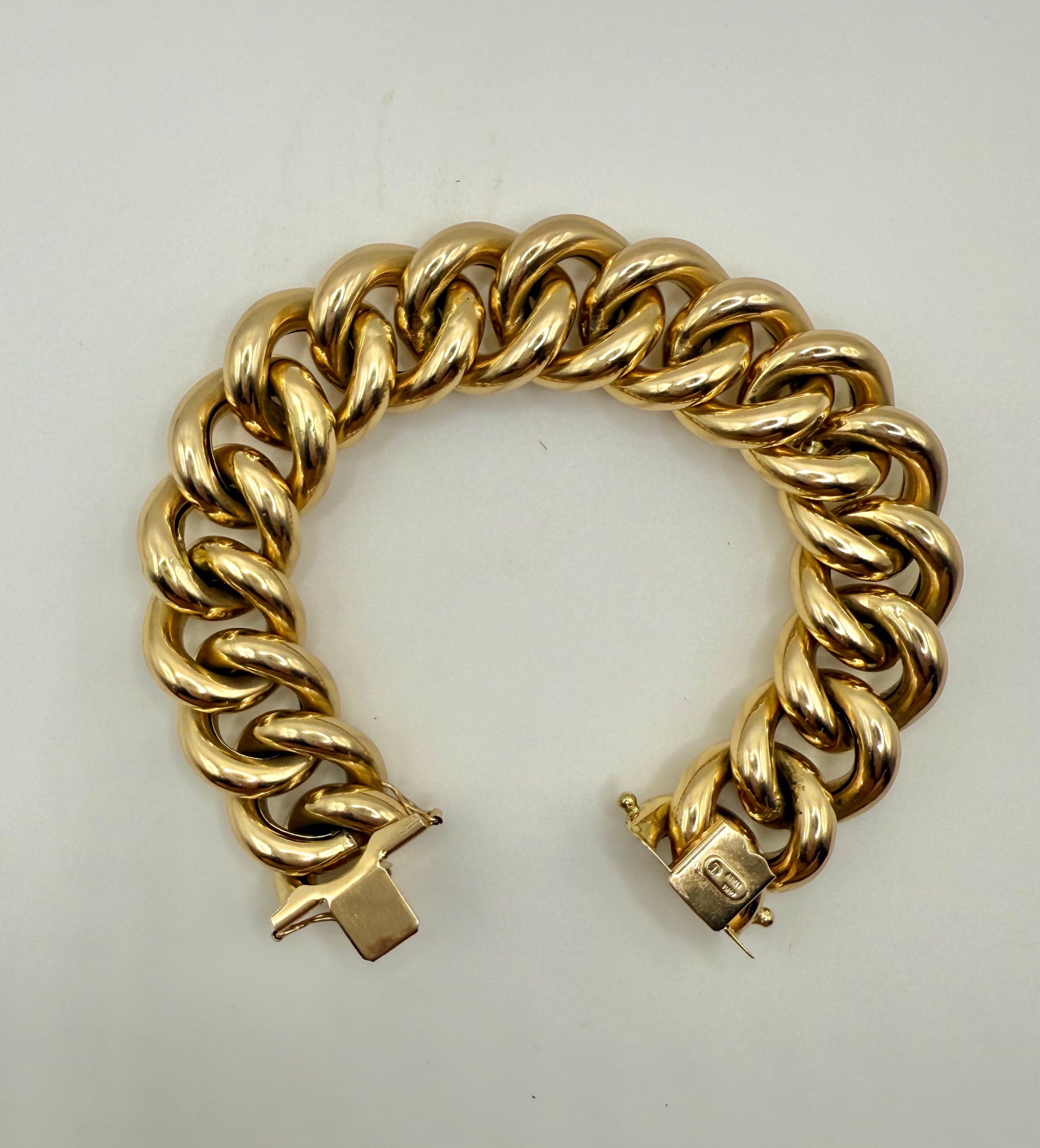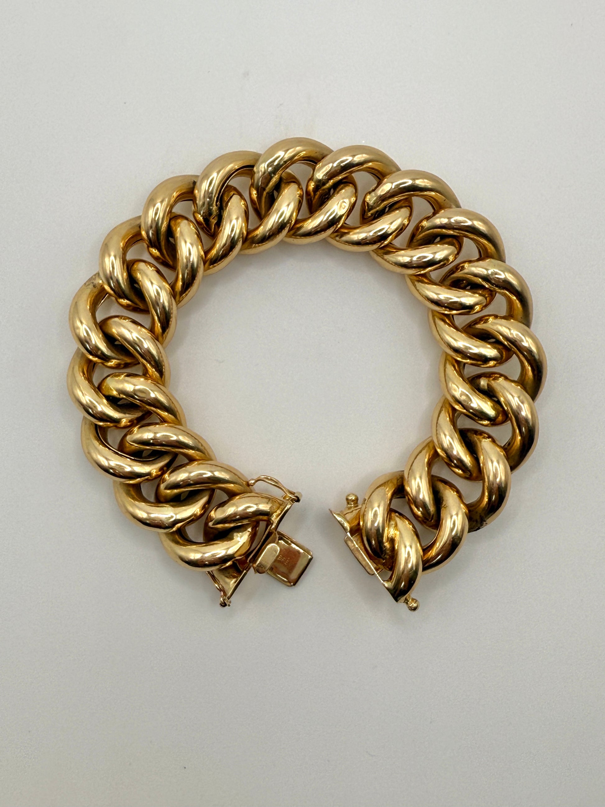 A beautiful large curb statement bracelet. This estate bracelet is in excellent condition with minor wear. It is hallmarked 14K made in Italy. The bracelet is hollow, but you get the look of a 100gram bracelet for a fraction of the cost. The interior dimension is closer to 7.25 inches since the links are so thick.