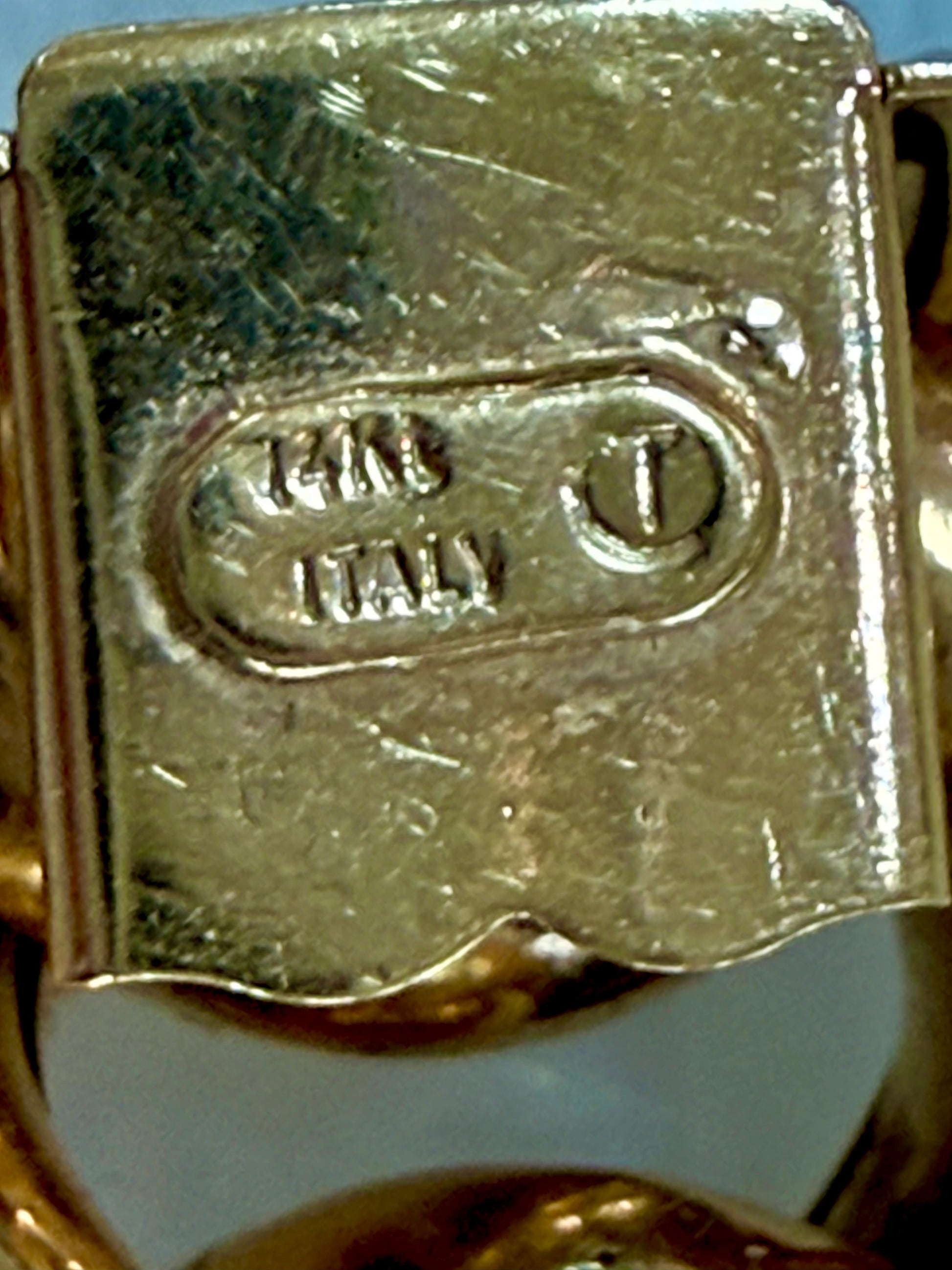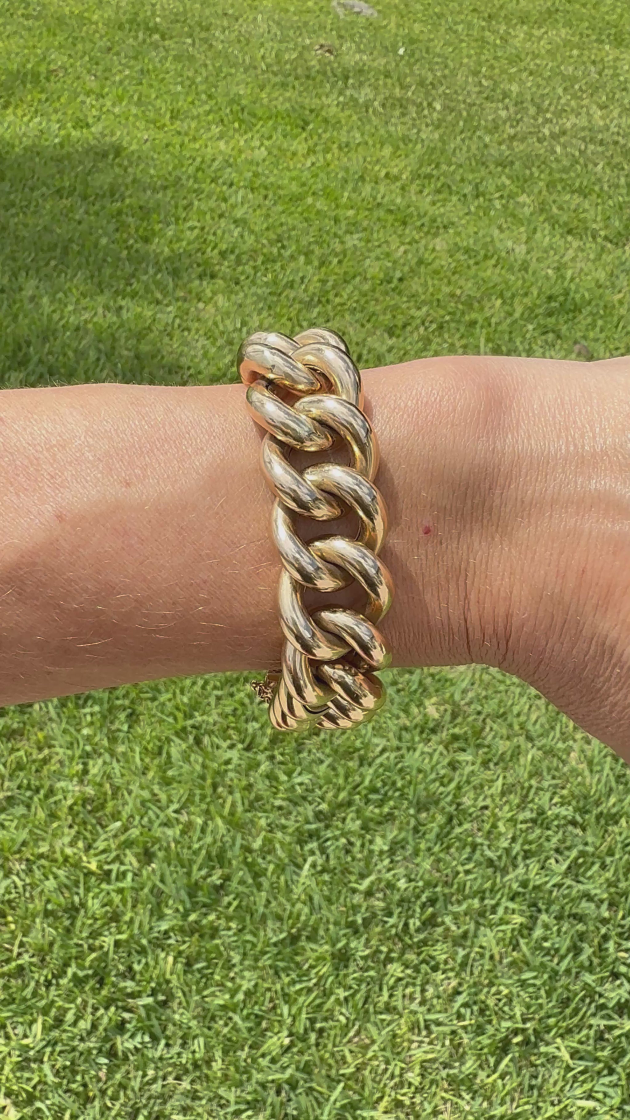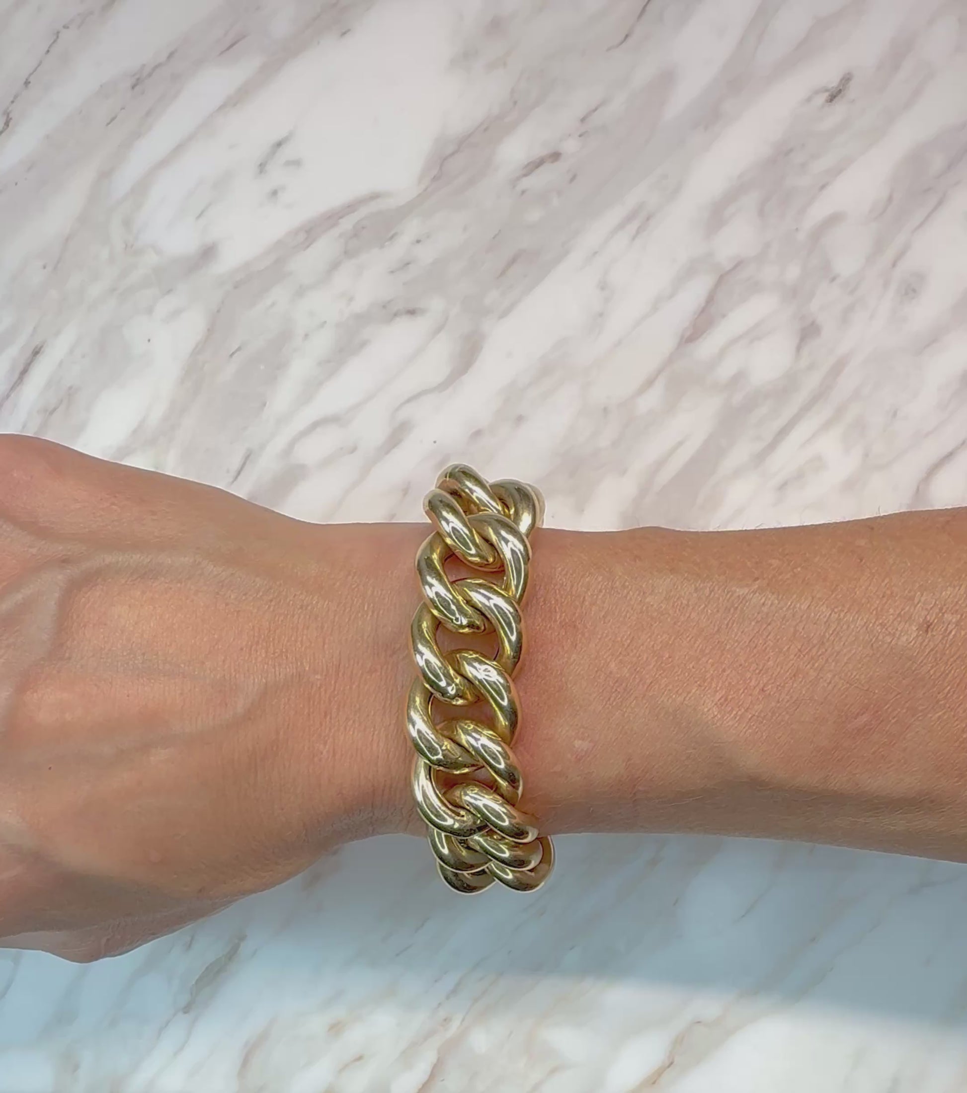 A beautiful large curb statement bracelet. This estate bracelet is in excellent condition with minor wear. It is hallmarked 14K made in Italy. The bracelet is hollow, but you get the look of a 100gram bracelet for a fraction of the cost. The interior dimension is closer to 7.25 inches since the links are so thick.
