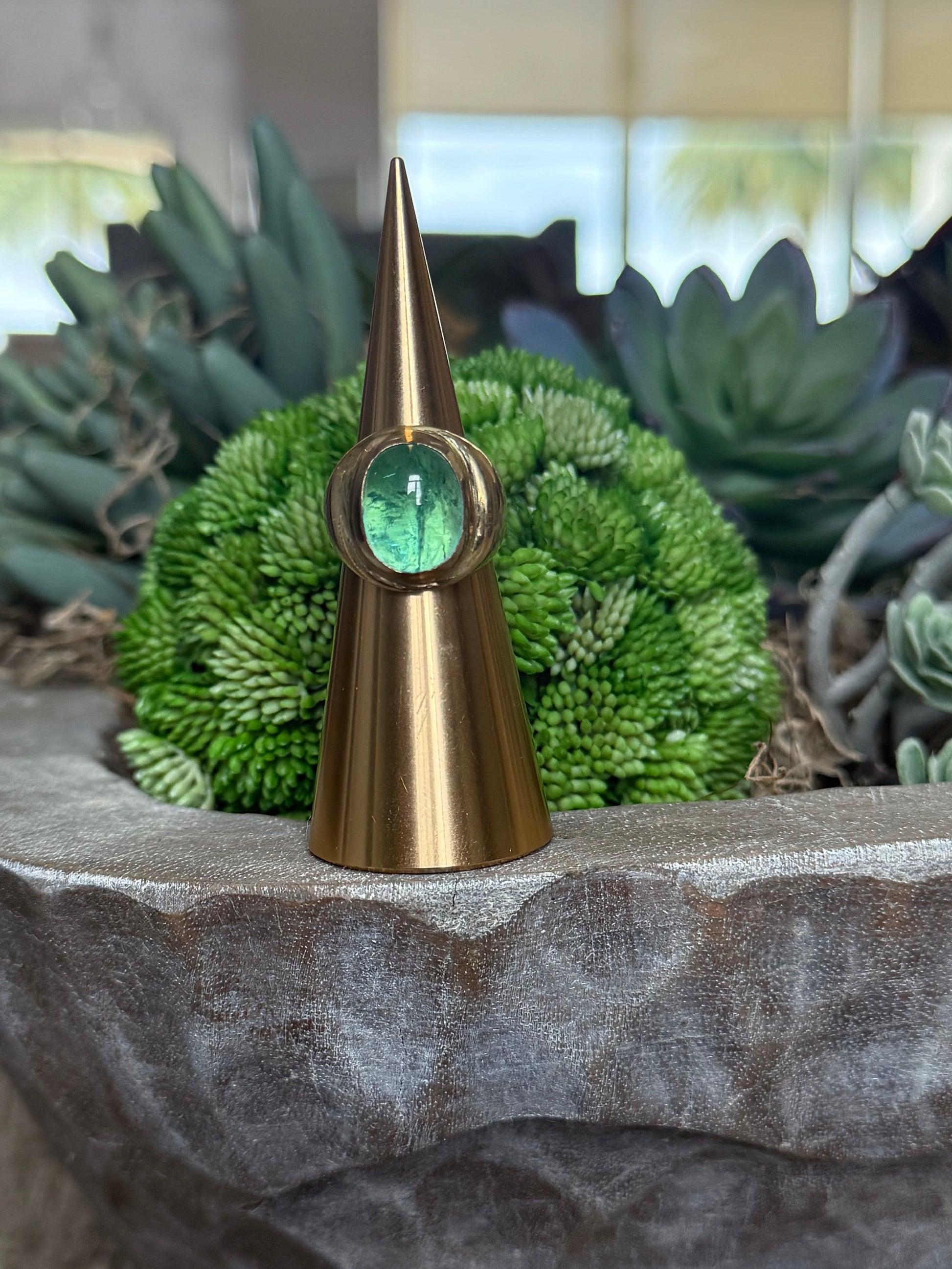 A absolutely stunning Mint Green Tourmaline 16 carat cabochon ring. This ring was made by the “Lost Wax Casting” technique. Hand carved in wax, casted, and set in the most buttery 18K gold . The stone itself measures 15 x 12x 10 mm’s. It has beautiful height to the stone like a sugarloaf cabochon.