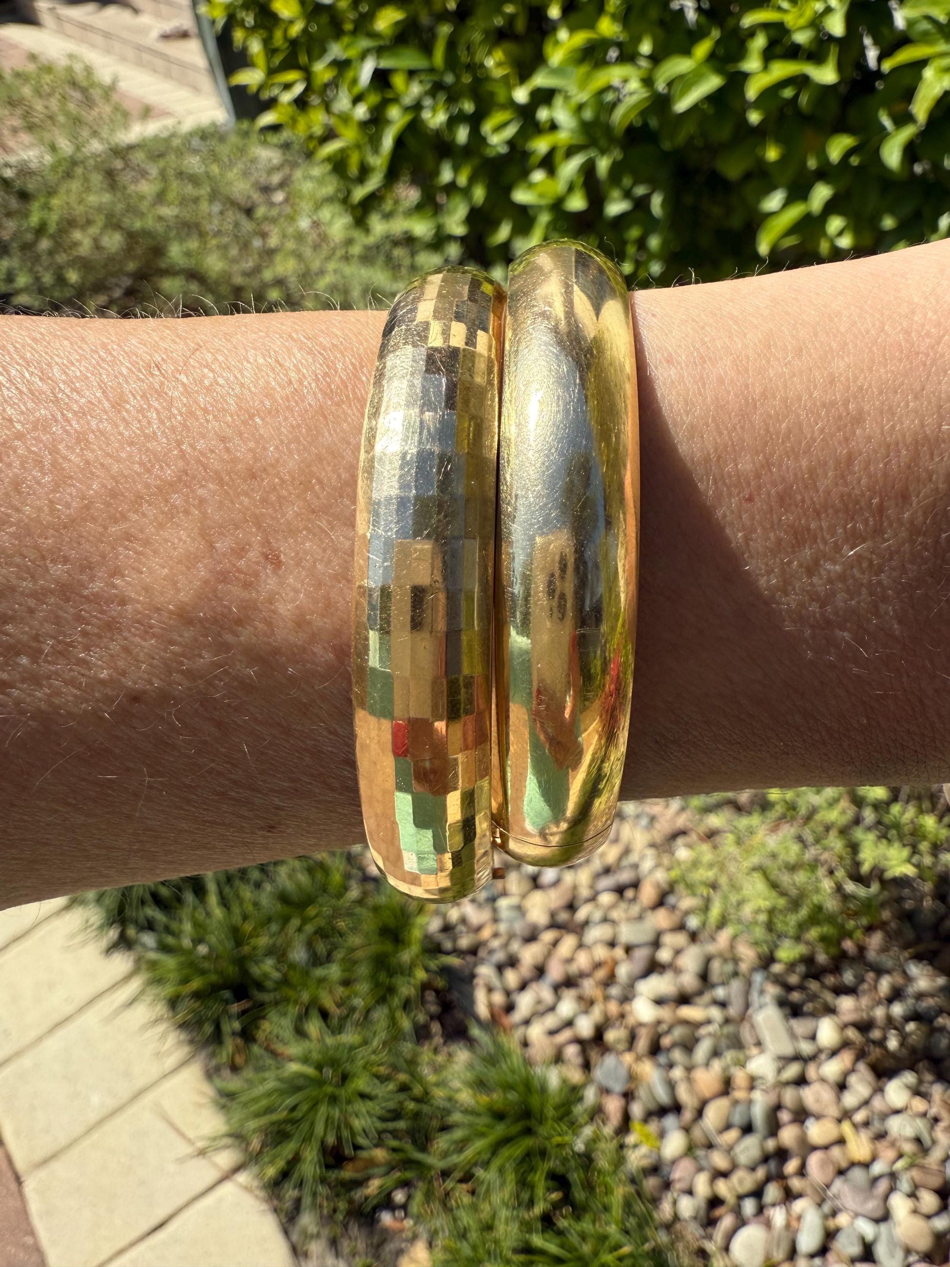 Two beautiful matching bangles. Both bangles are 14k gold . The interior measures 2.5”. I have a 6.5” wrist and they fit perfectly. Both bracelets are in excellent condition.