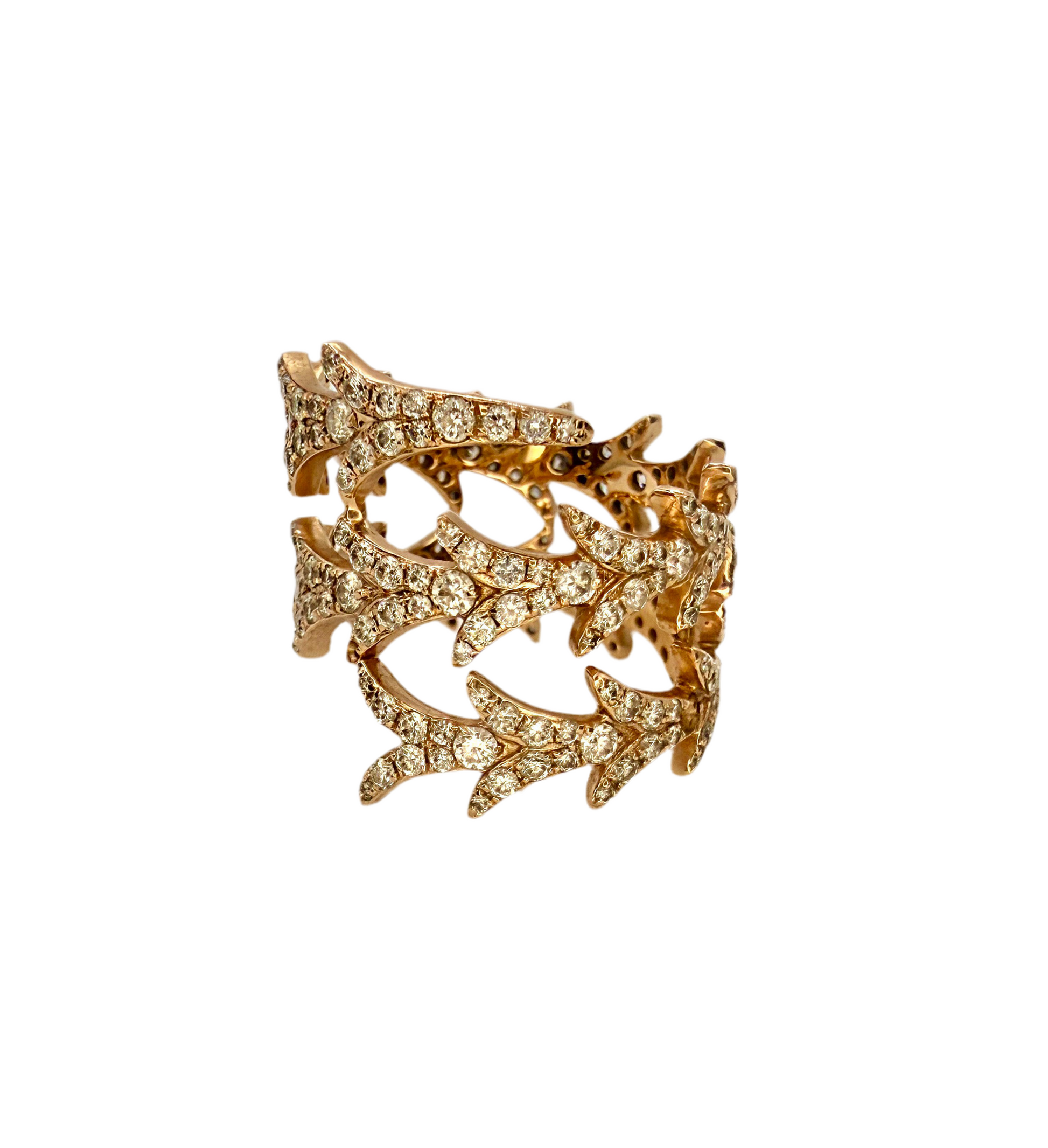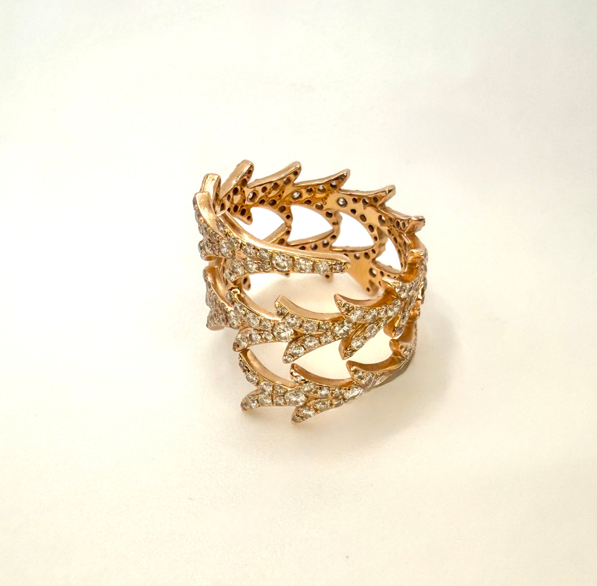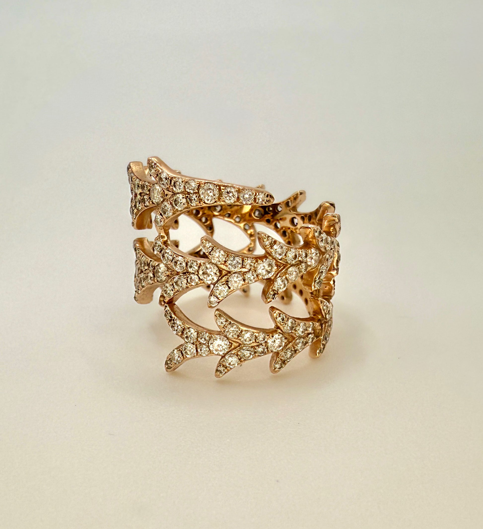 A beautiful rose gold diamond eternity band. This diamond band has a beautiful arrow design, with three rows that wrap around. It’s 14K of rose gold and features 2.00 carats of round brilliant diamonds. The diamonds are near colorless. This item has been discounted due to (2) small diamonds that are missing, on the backside.