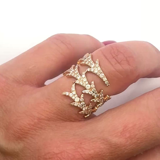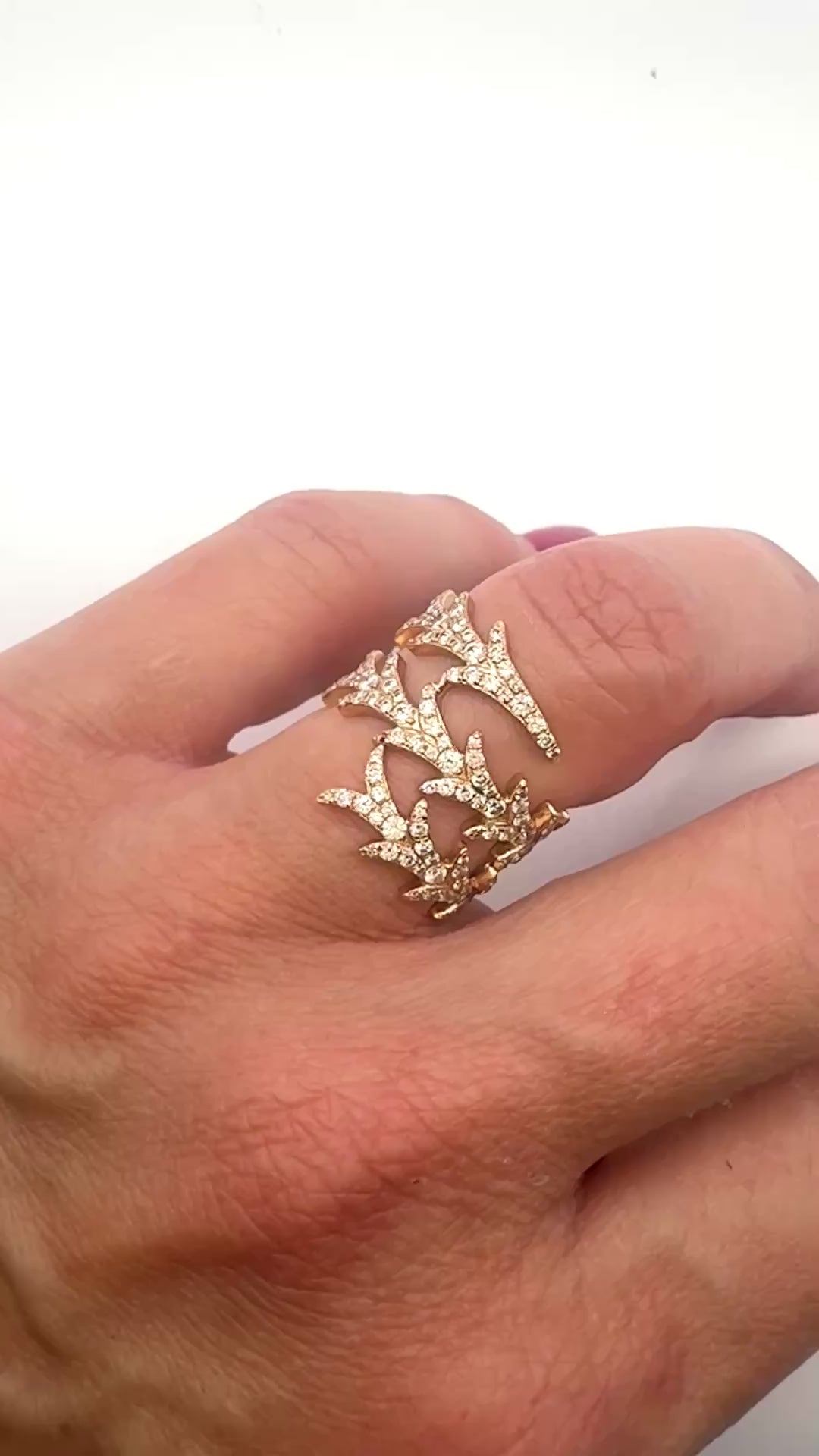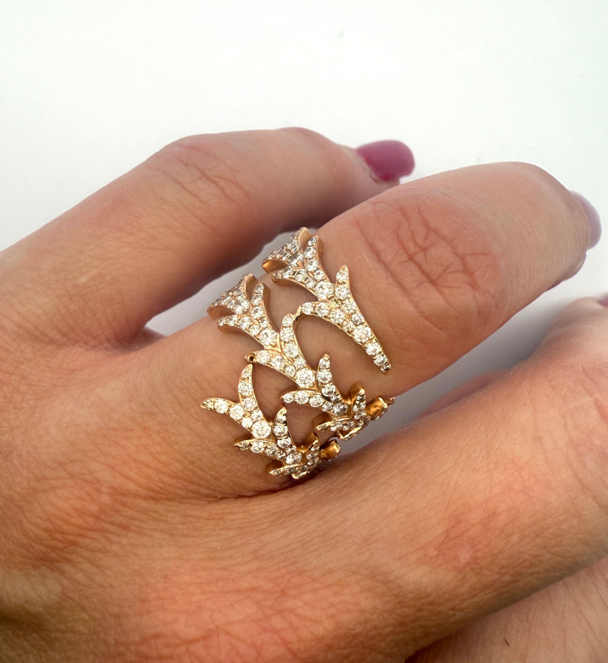 A beautiful rose gold diamond eternity band. This diamond band has a beautiful arrow design, with three rows that wrap around. It’s 14K of rose gold and features 2.00 carats of round brilliant diamonds. The diamonds are near colorless. This item has been discounted due to (2) small diamonds that are missing, on the backside.