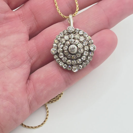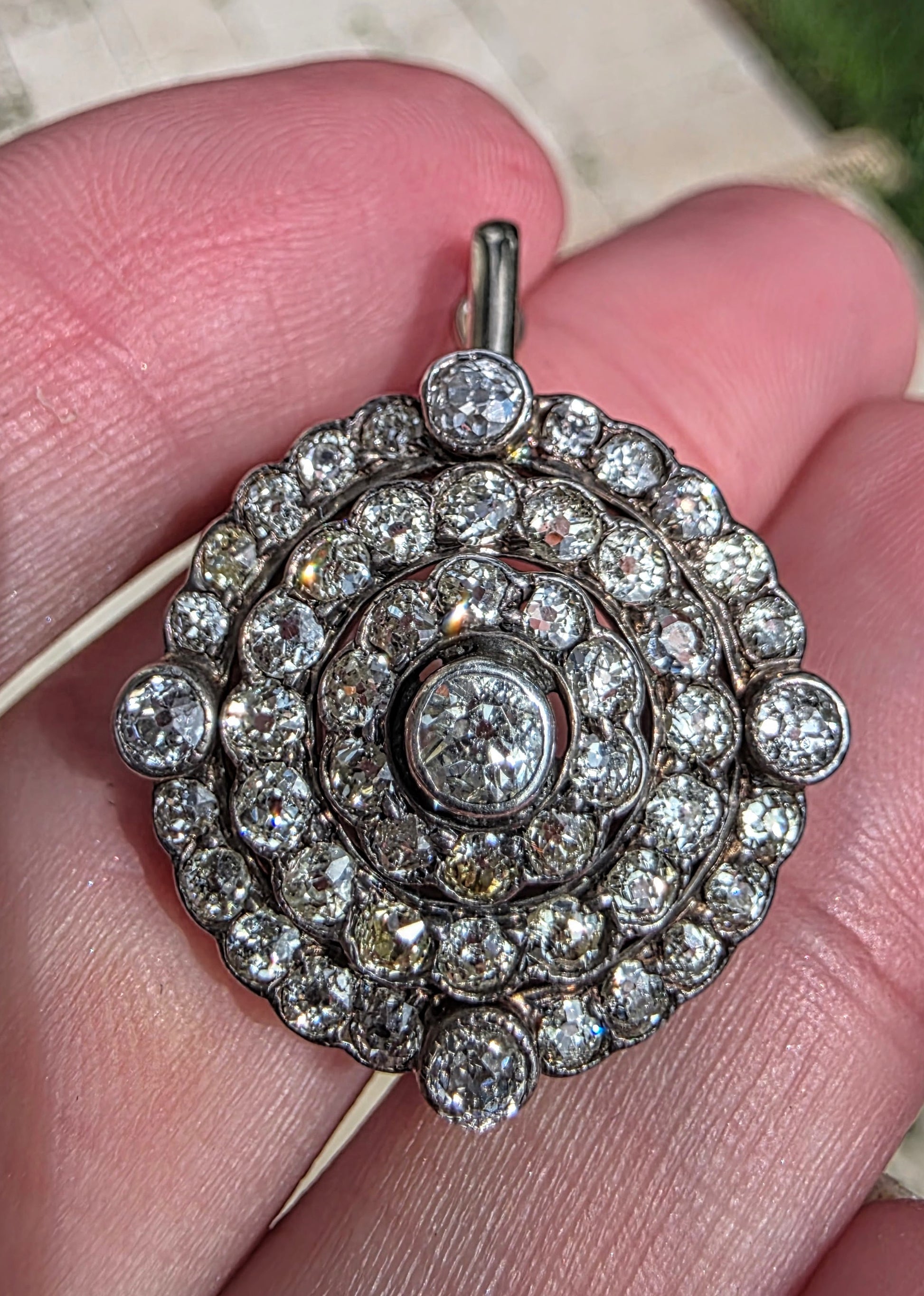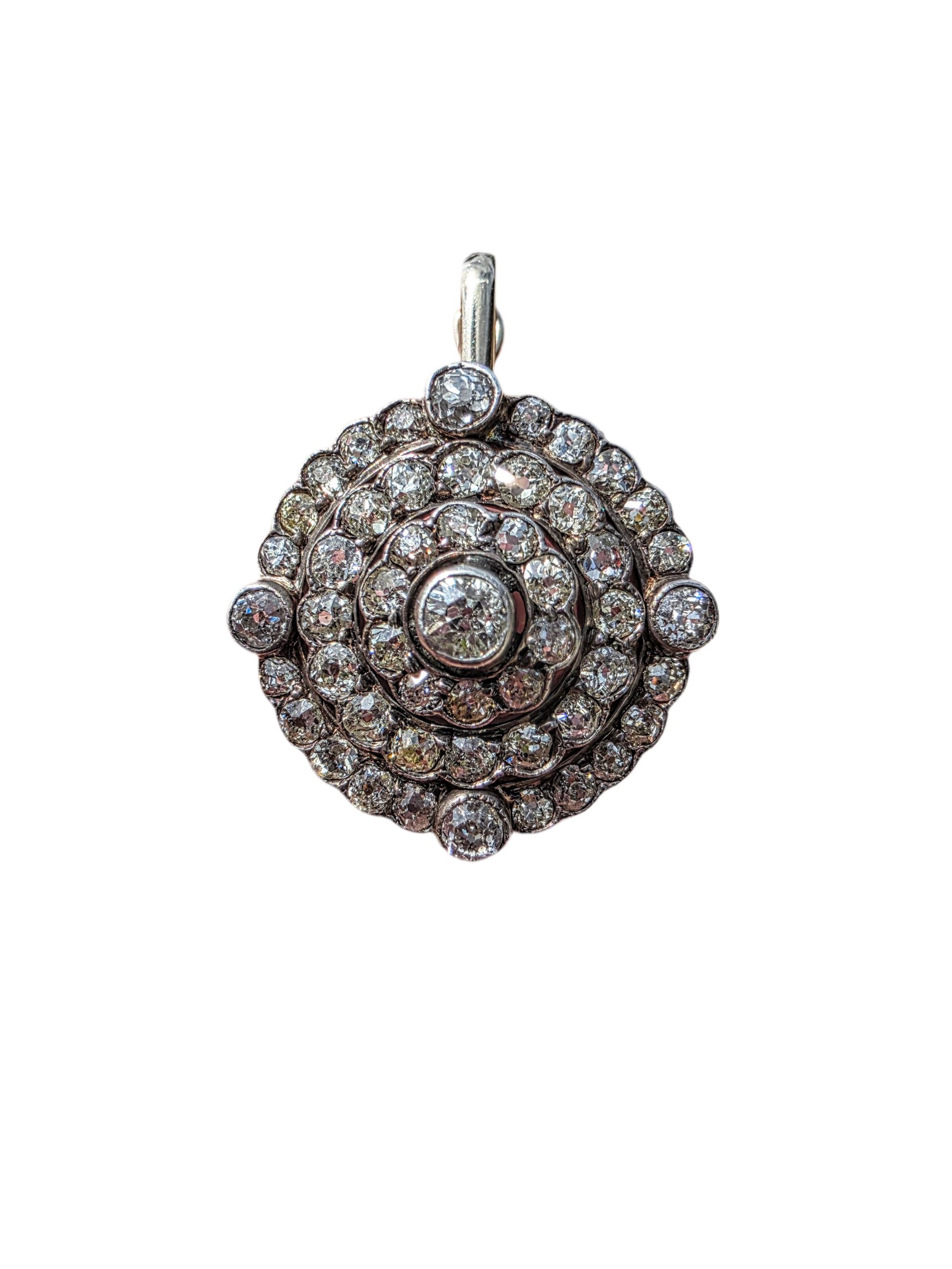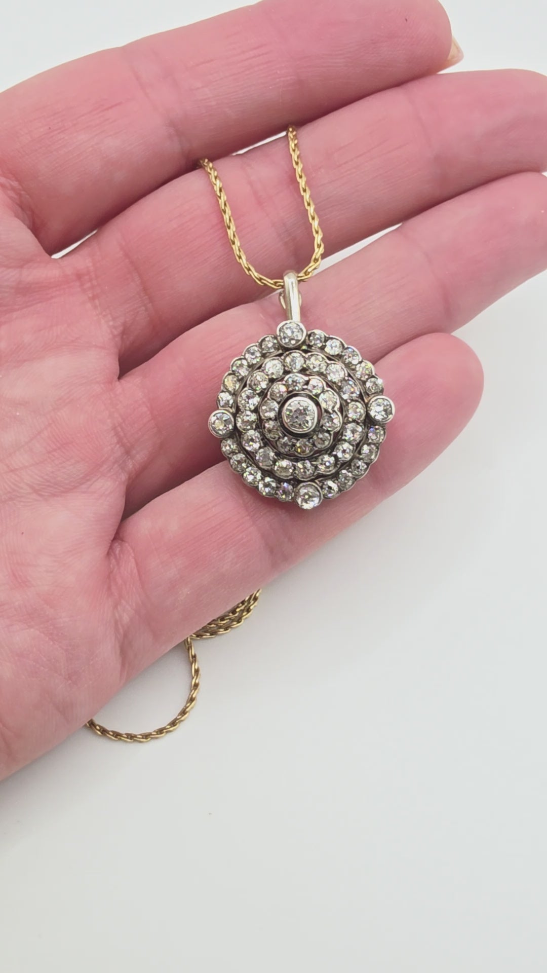 A beautiful Old European diamond pendant.The pendant features 51 old European cut diamonds weighing approximately 2.5 carats. The setting is silver topped with a solid 14K yellow gold pendant mounting. The pendant is a beautiful circle design with a bail that has a figure 8 clasp for ease of attaching to chains. The pendant measures approximately 1”