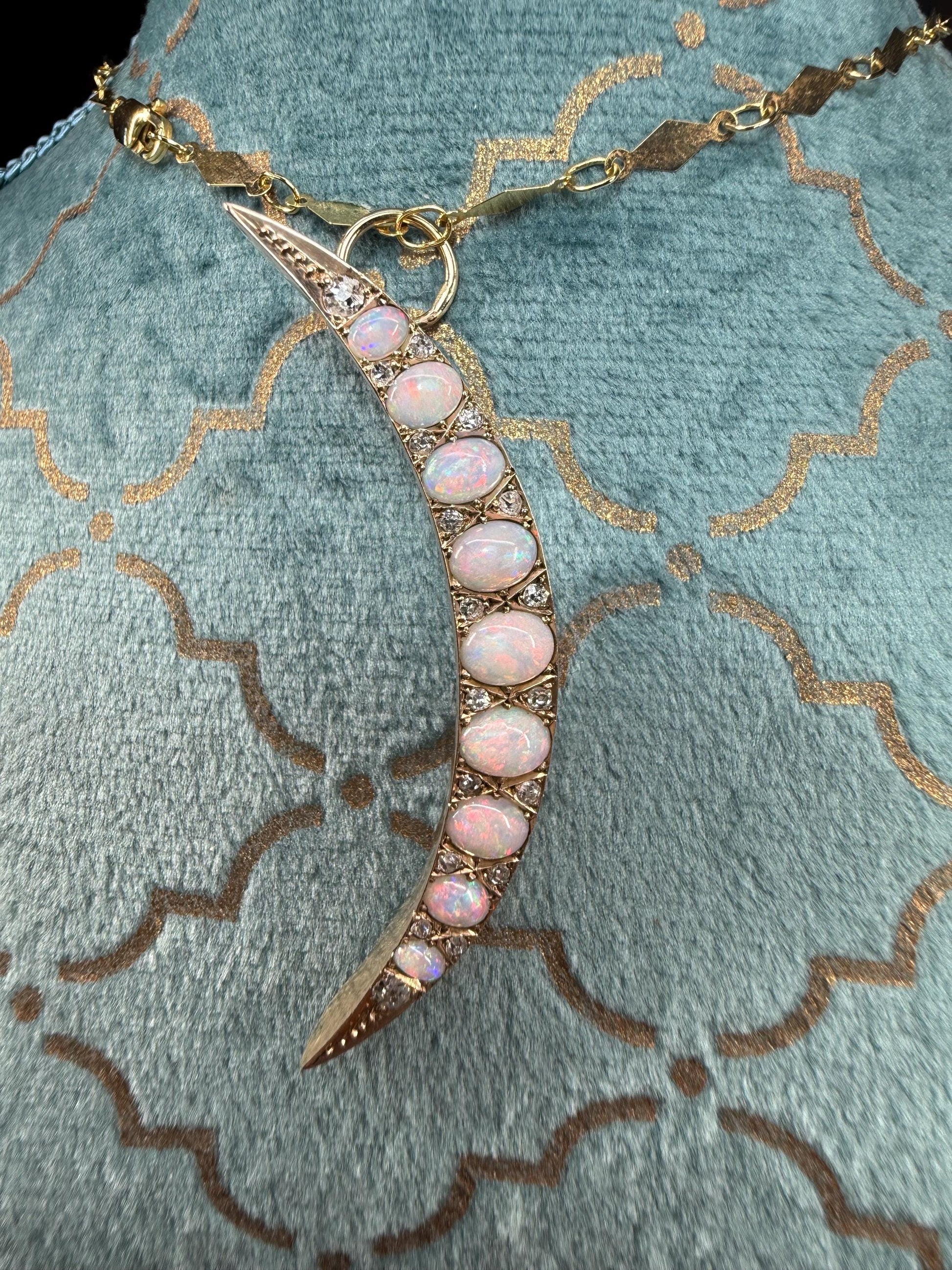 A stunning Victorian Opal Brooch that was converted to a pendant. The pendant has beautiful white australian opals that have great play of color with variations of white and pink and a small hint of blues. The pendant stacks beautifully with other antique chains. It’s 5cm long and 6mm wide. The pendant weighs 4grams. The listing is for the pendant only.