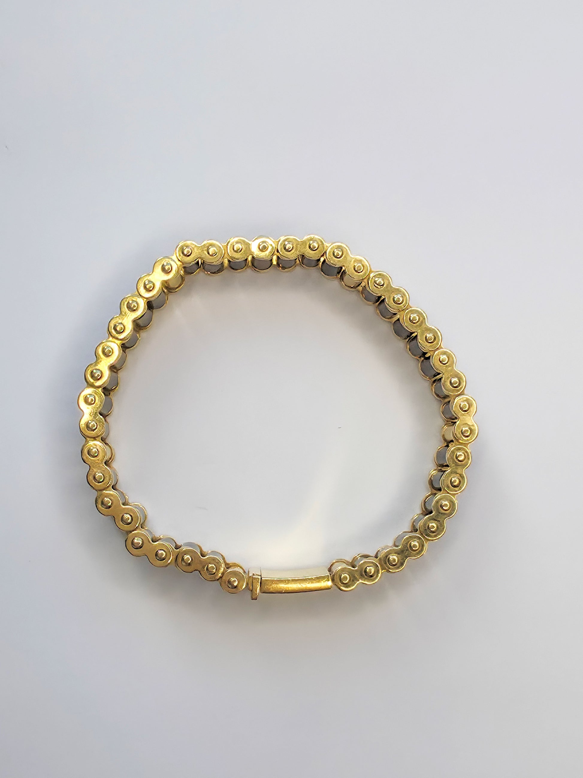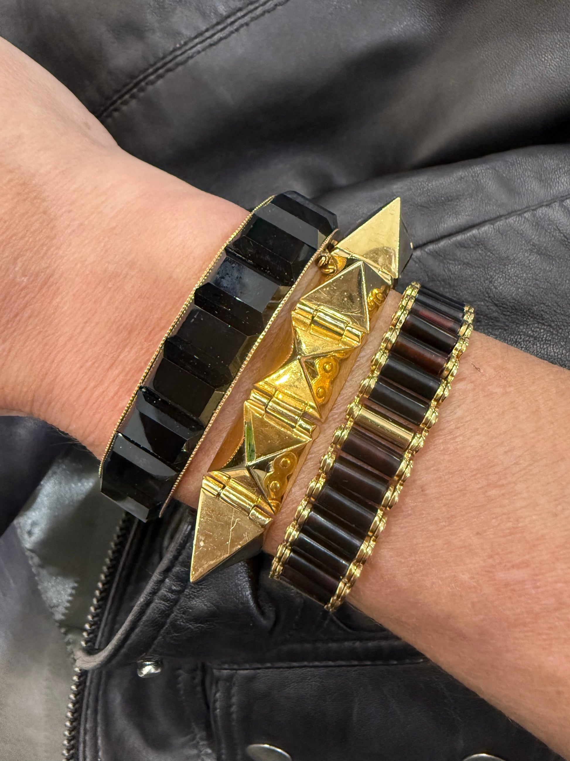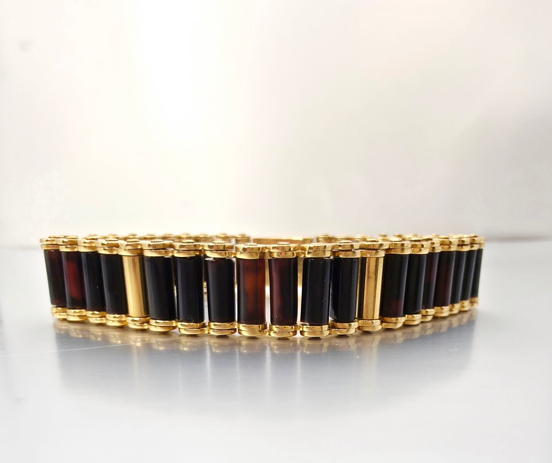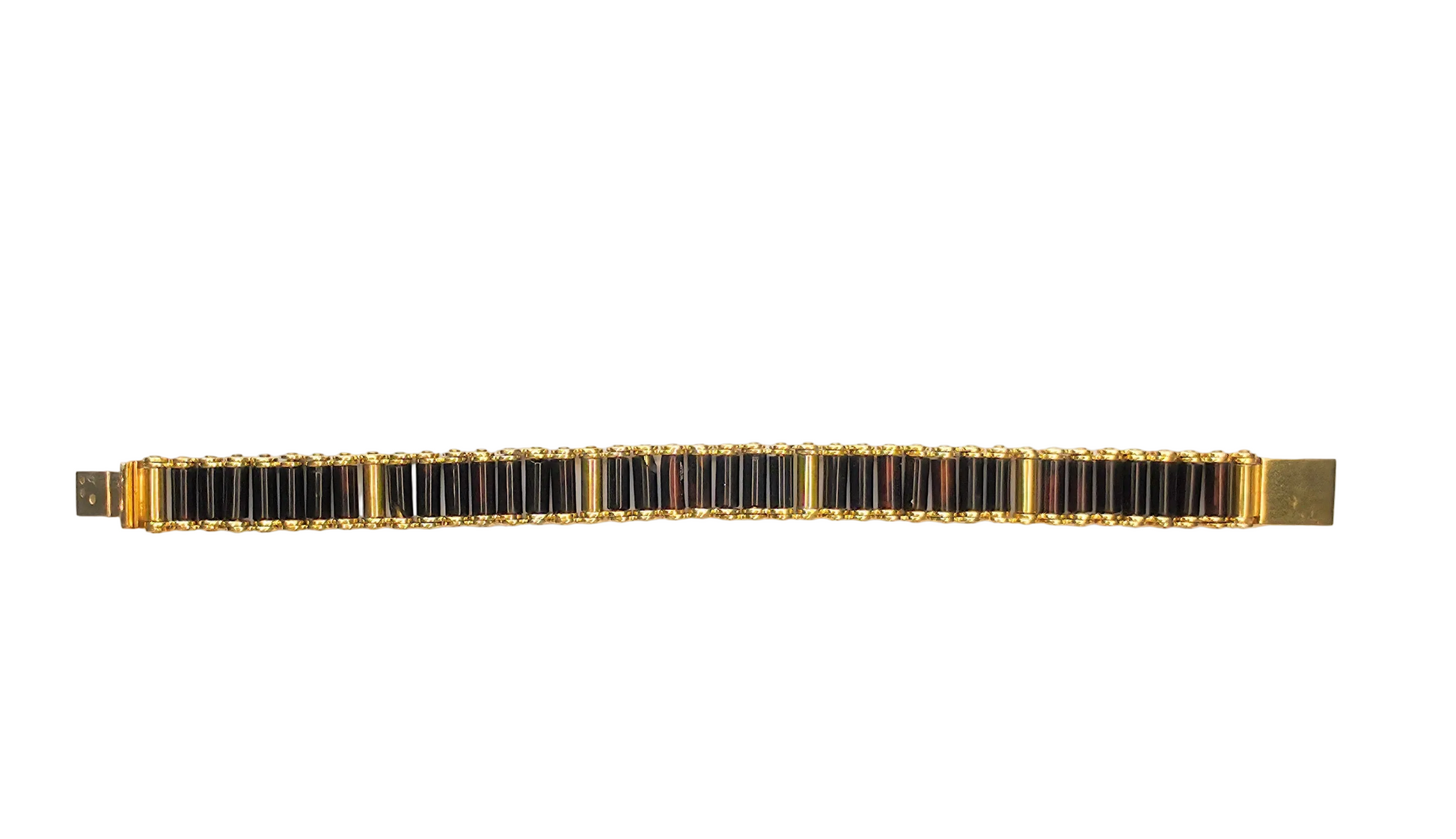 A striking example of mid-20th century Italian craftsmanship, this vintage bracelet features sleek onyx tube beads elegantly set along polished 18K gold bar links. The bracelet exudes timeless sophistication and is a testament to the fine jewelry style of the 1940s.