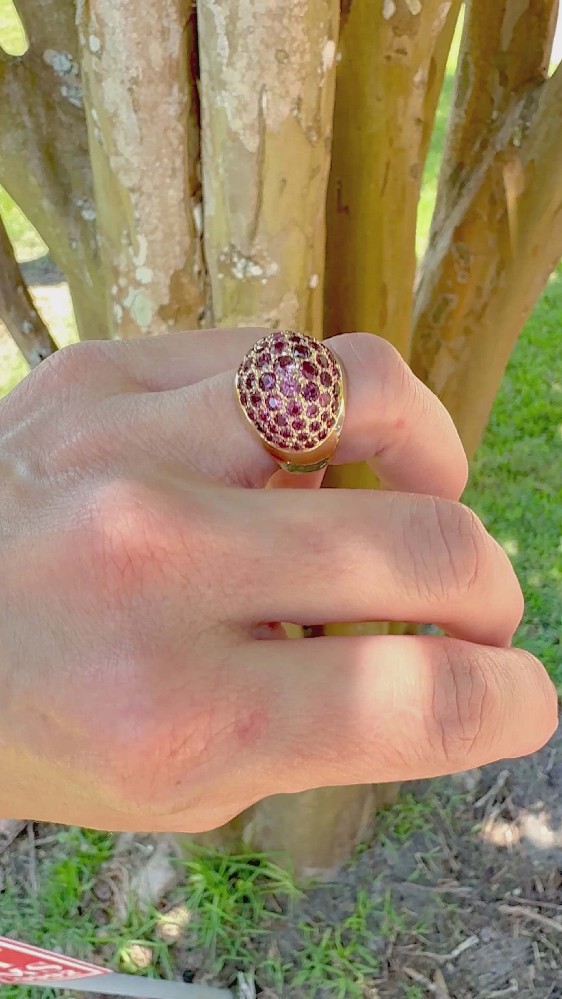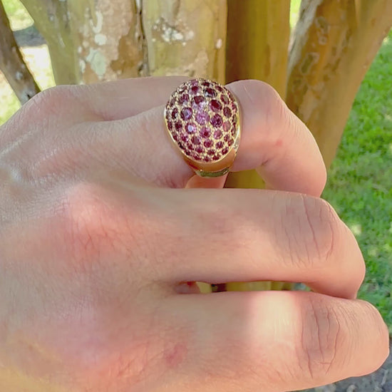 A vibrant vintage Ruby Dome ring set in solid 14K gold. This ring is a great statement piece and is very good condition for its age.